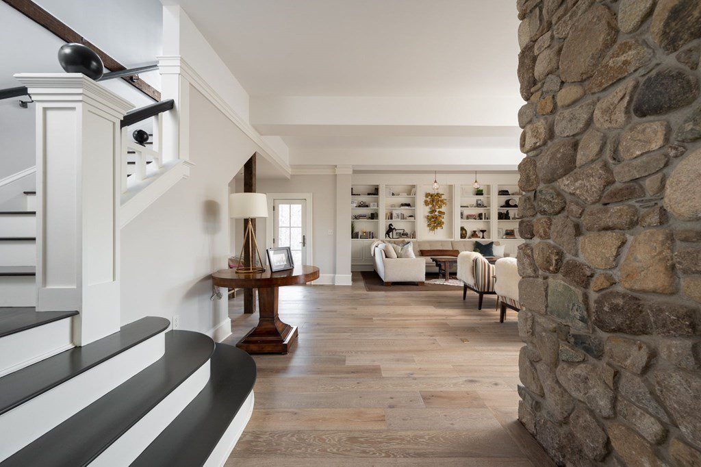 Large scale rooms, walls of windows & grand ceiling height create an inspired space flooded with natural light. The great room is anchored by a stunning floor to ceiling fieldstone fireplace.