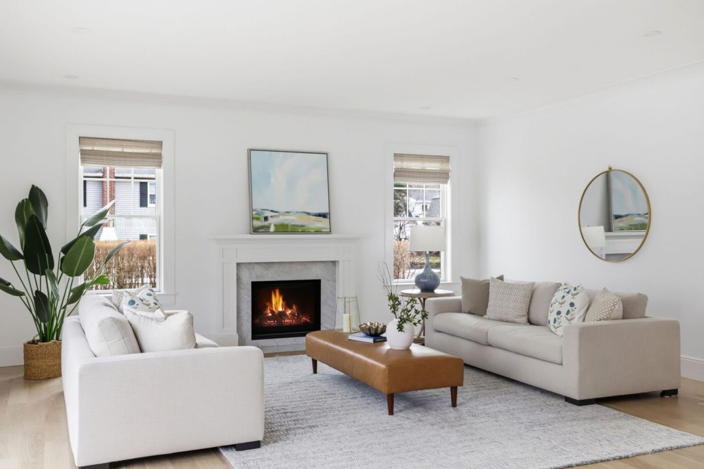 White oak floors run throughout, creating a warm, cohesive backdrop for both everyday living and elegant entertaining. A custom mudroom with built-in lockers and a private home office add both sophistication and functionality.