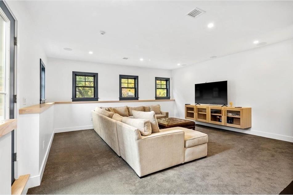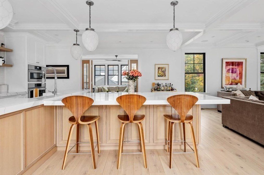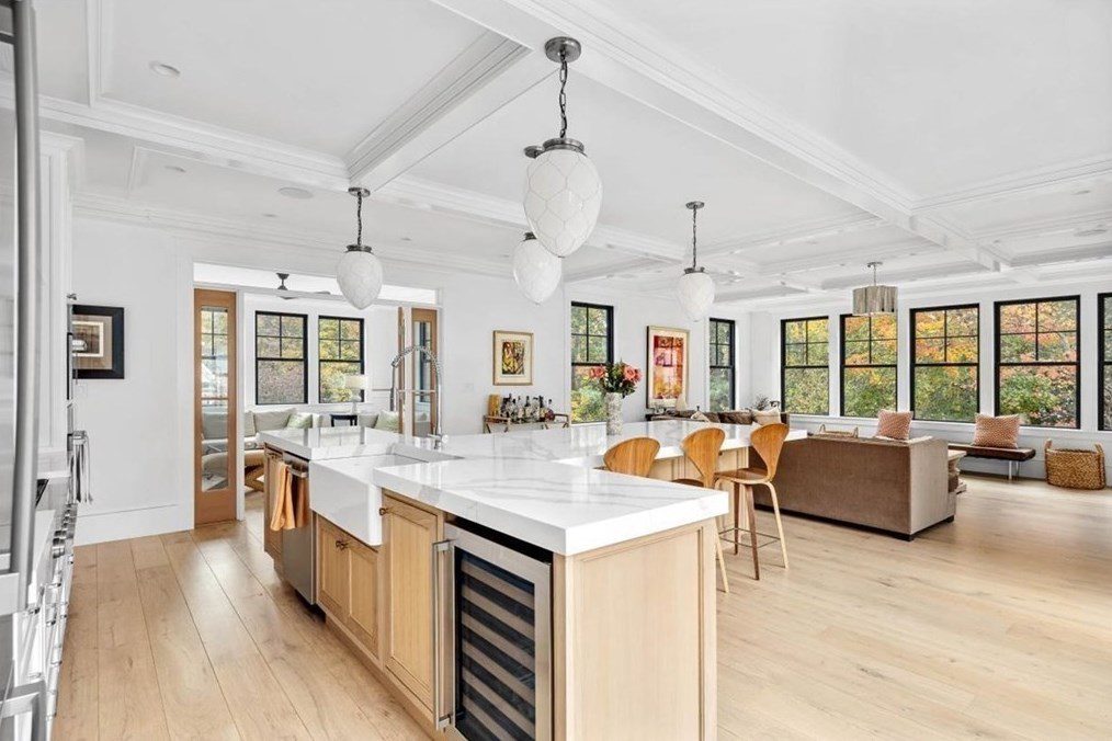 The state-of-the-art kitchen is a chef’s dream, featuring top-of-the-line appliances and an expansive island, perfect for hosting family and friends.