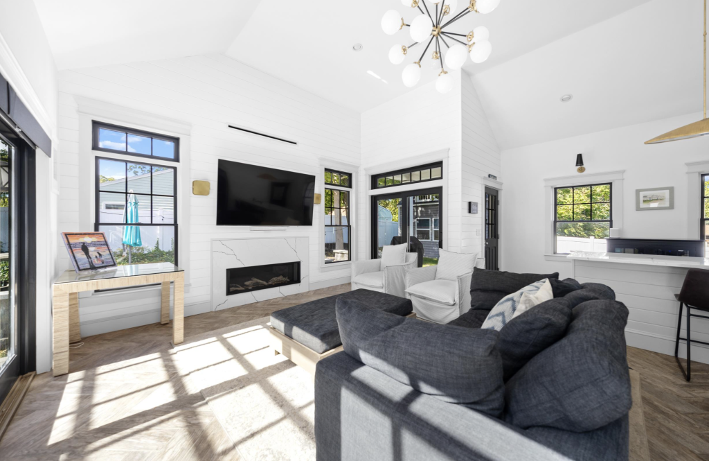 The high-end kitchen with a generous island opens seamlessly to the dining area and an inviting living room framed by a wall of windows. A cozy den sits just off the kitchen, while the stunning great room, complete with shiplap walls, vaulted ceiling, gas fireplace, and a built-in bar – ideal for entertaining!