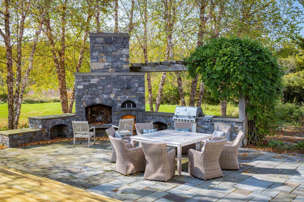 Designed for effortless entertaining, the contemporary dining area and gourmet kitchen flow seamlessly to a back deck, gazebo, and stone outdoor fireplace complete with a pizza oven. A veggie garden adds charm and utility.