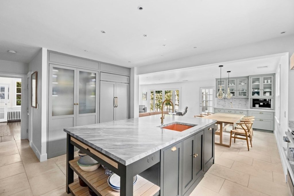 The English-inspired kitchen by Jewett Farms + Co. boasts hand-carved marble sinks, copper accents, and stunning Italian marble countertops—truly a chef’s dream.