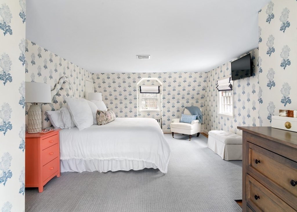 The living room with grass-cloth wallcovering, floor-to-ceiling bookcases and wood burning fireplace opens to a bonus family room with a second fireplace. The 2 story mudroom/entry foyer, flooded with natural light, completes the first floor.