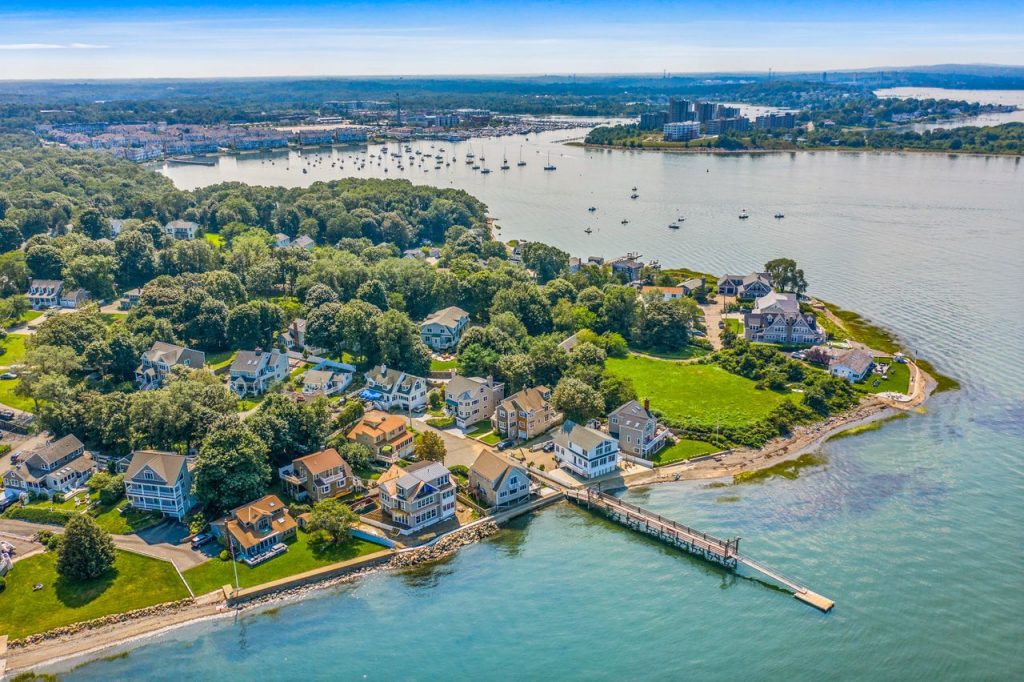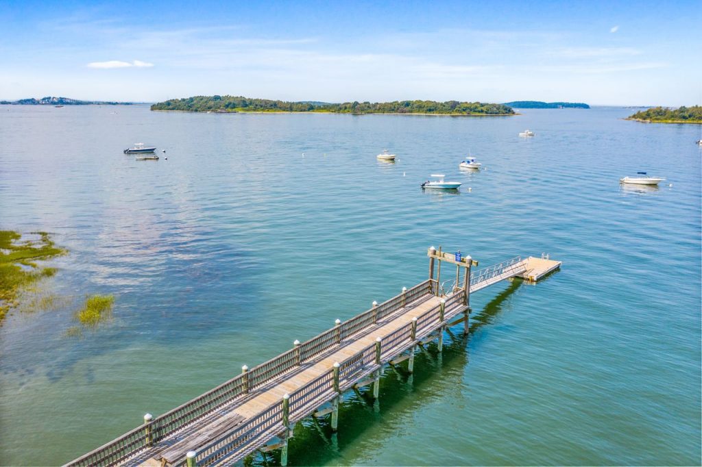 Overlooking the neighborhood dock, with a boat mooring, and a beach and within walking distance to lots of restaurants, and the commuter boat to Boston.