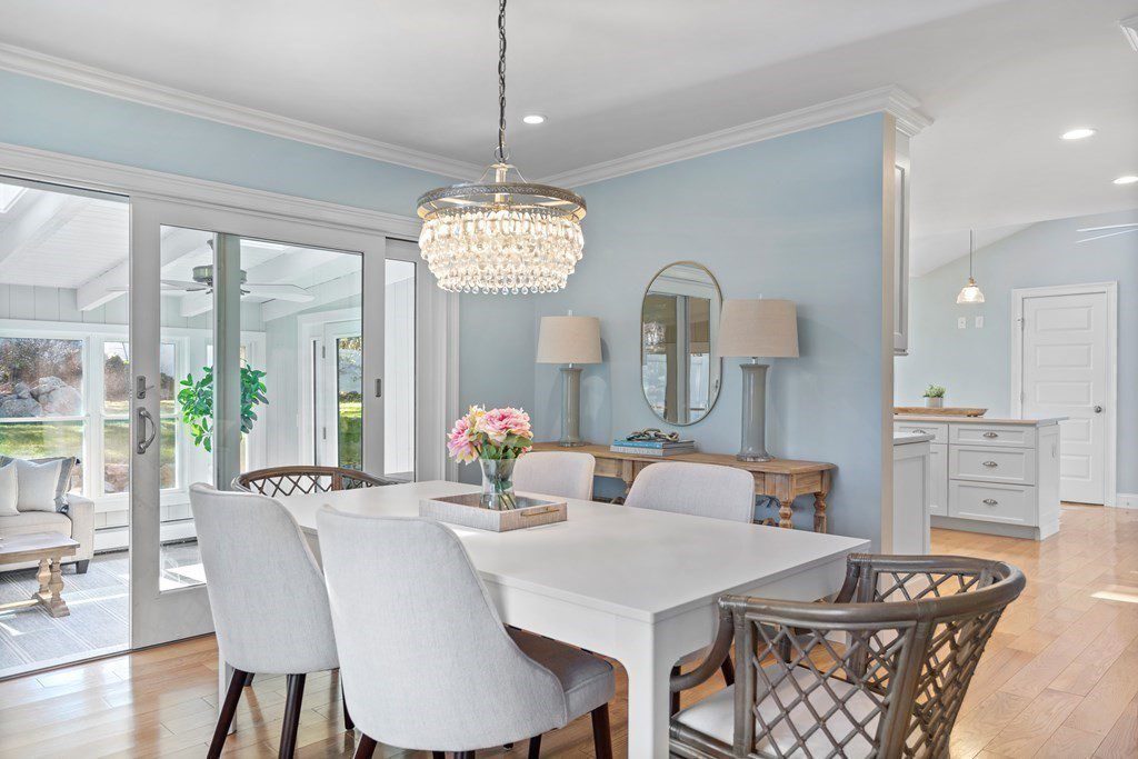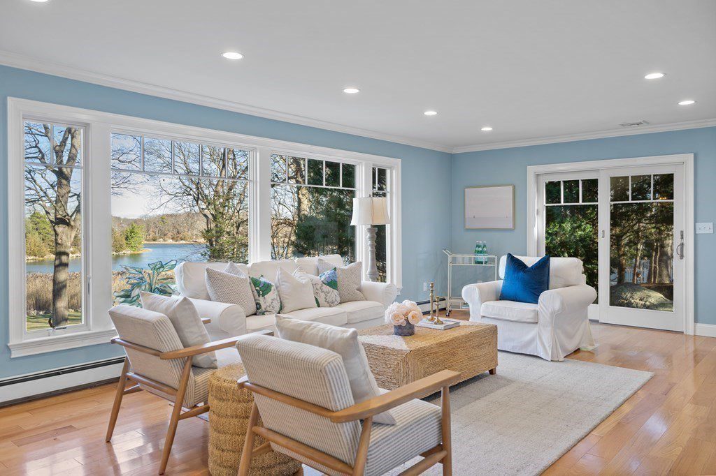 The kitchen is perfect for hosting and features white stone countertops and crisp white cabinets. The bright four seasons sunroom, with floor-to-ceiling windows overlooks the well-landscaped backyard.