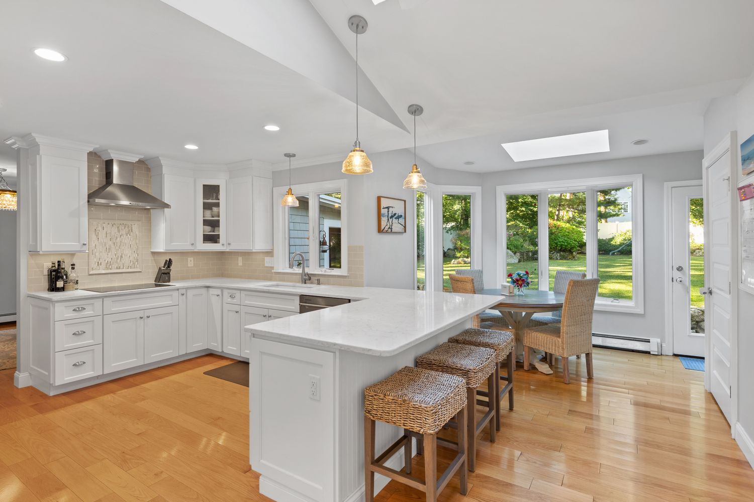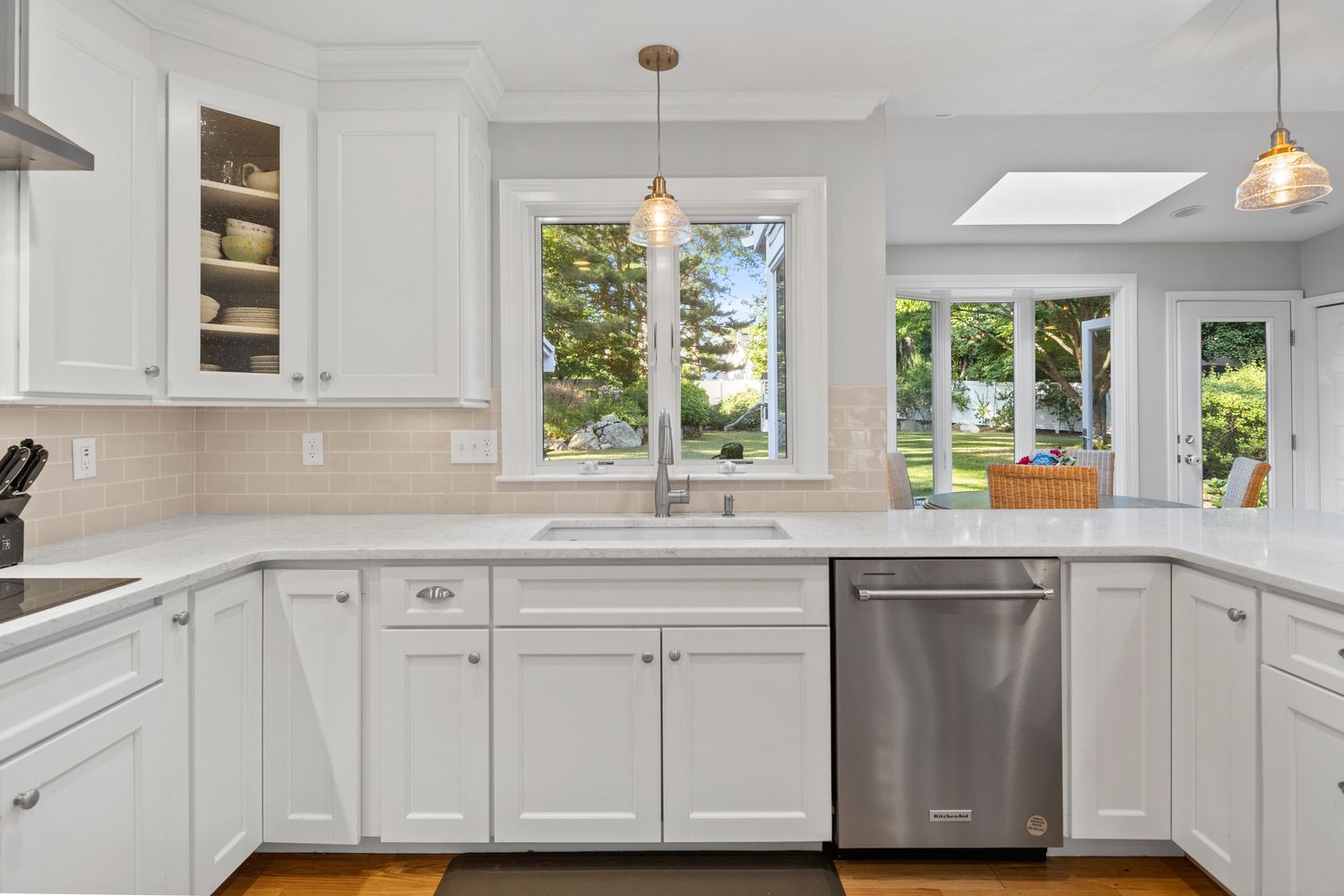 Upon entering the home, you’re greeted with a cozy sun-drenched great room with water views and a wood burning stone fireplace. Perfect for hosting, the simple yet beautiful kitchen features white stone countertops, crisp white cabinets and newer appliances.