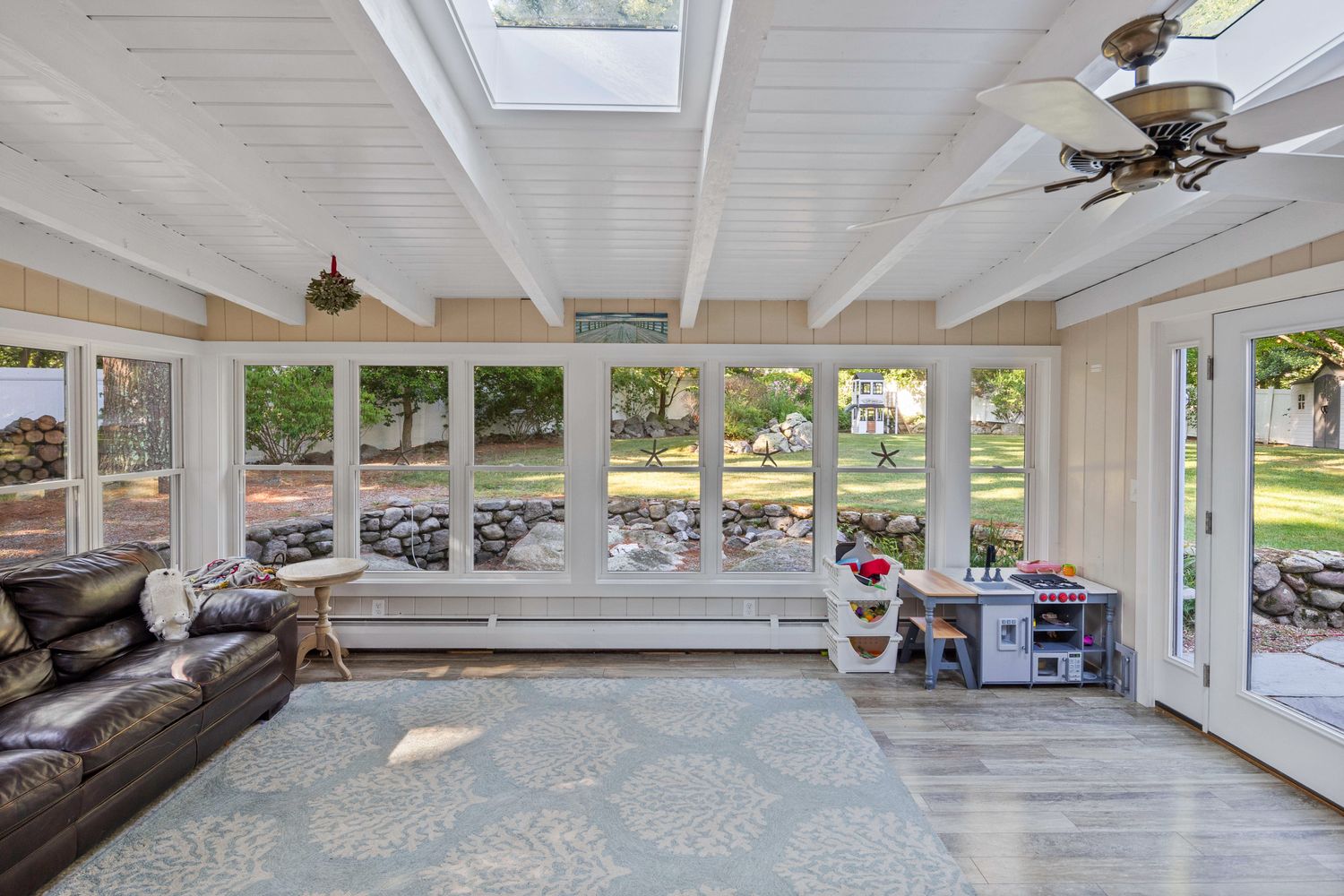 The bright four seasons porch with floor to ceiling windows, which can be used as a living room, playroom, etc., overlooks the sizable backyard.