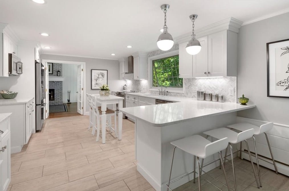 The beautifully remodeled kitchen with quartz countertops, custom cabinetry and stainless steel appliances opens to front to back family room with wood burning fire-place. Nicely done half bath, pantry and laundry complete the first floor.