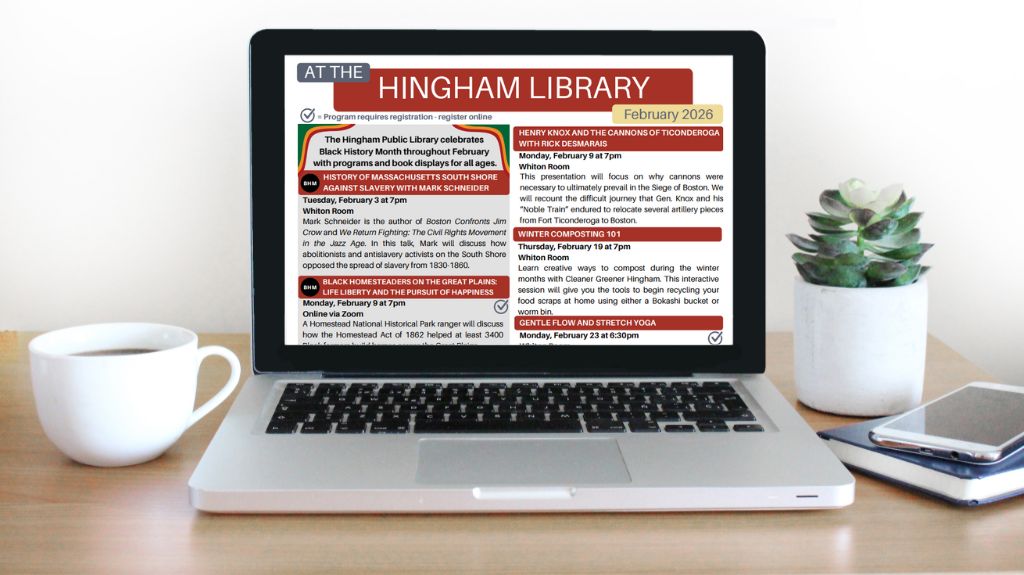 The Hingham Public Library has lots of great classes and programs happening in February! Take a look at the February newsletter, available on the Library website at hinghamlibrary.org/Newsletter.