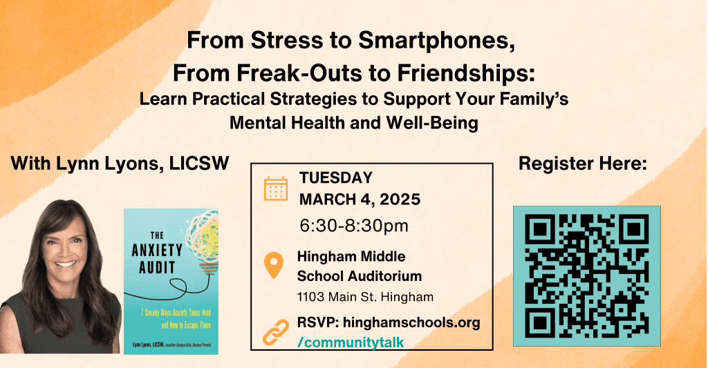 Join us for an informative community talk and Q&A with best-selling author and clinical expert Lynn Lyons, LICSW, on March 4th, 2025, at 6:30 PM at Hingham Middle School.