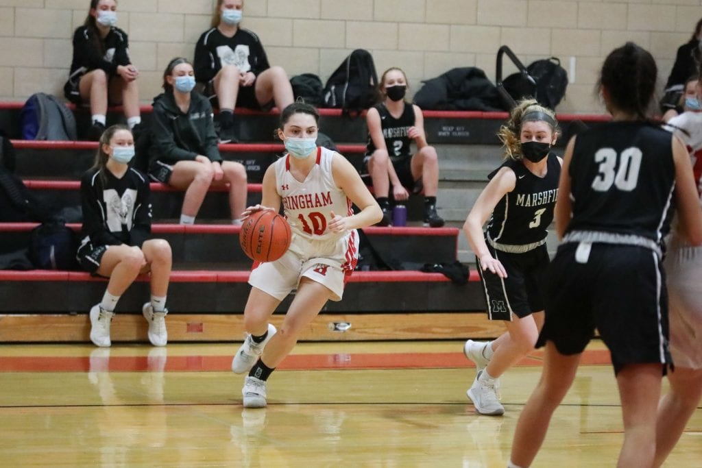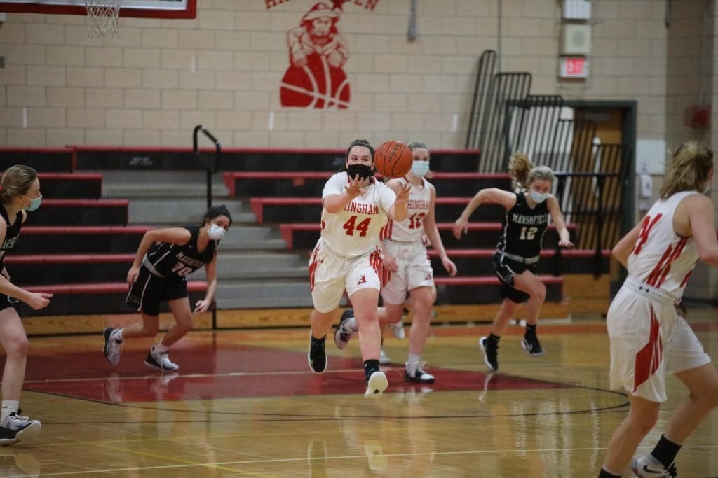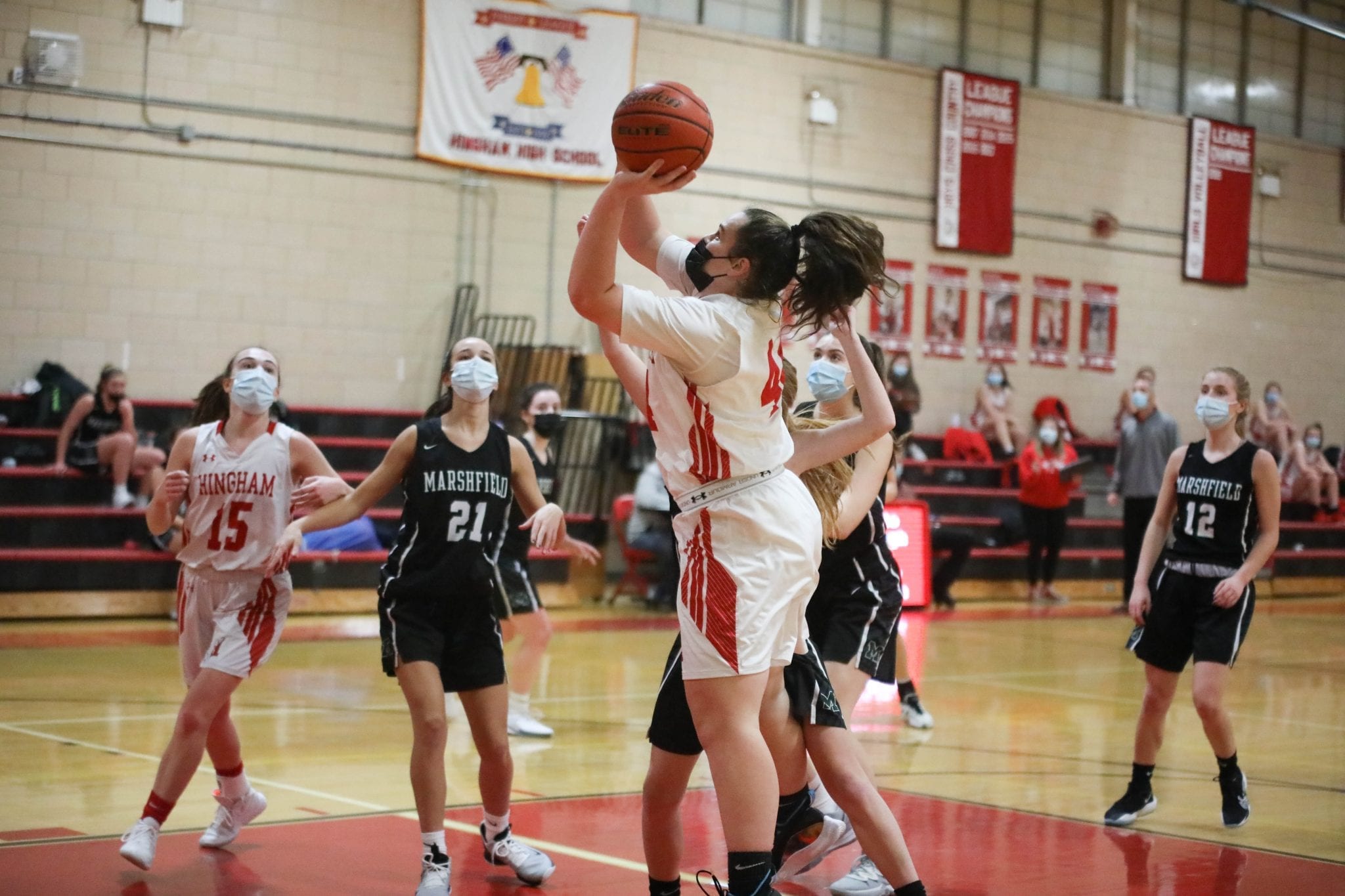 Last night’s girls basketball game between Hingham Harborwomen and Marshfield Lady Rams was one of those games that deserved fans in stands. Not only was it Hingham’s last regular season home game, it was a hard fought, back and forth, exciting game between two competitive teams.