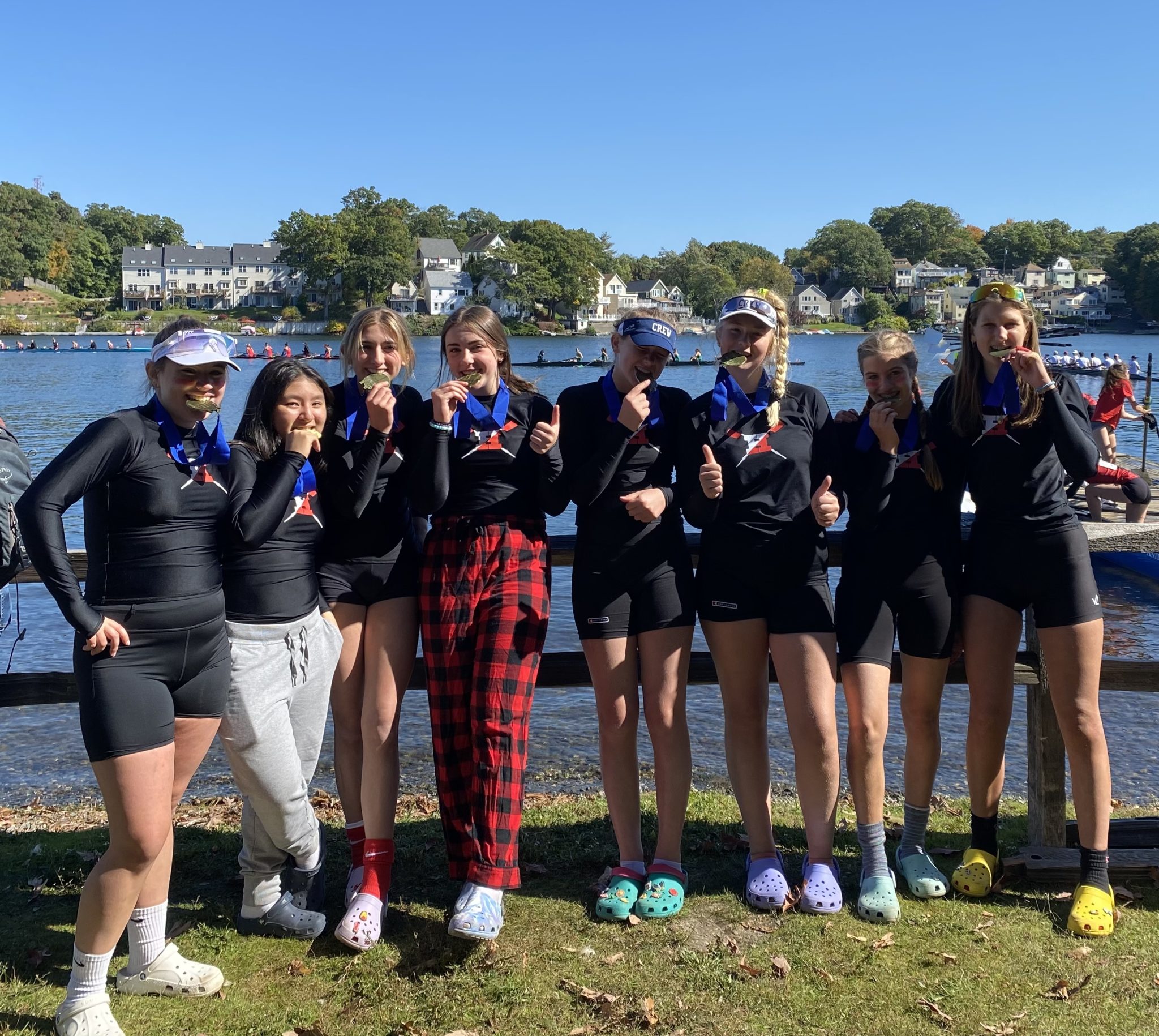 Crossing fifth out of 10 boats, the HHS girls first varsity crew included rowers Sophie Kerr, Maisie Knies, Maeve Schnorr, Elena Vasilakos, Marissa Matthews, Jane Betti, Sadie Neidecker, Abigail Brown, and coxswain Alexa Fox.