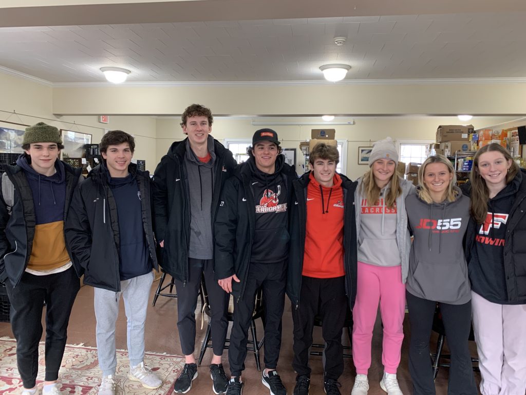 On Tuesday, team captains, Aidan Brazel, Ace Concannon, Billy Jacobus, Chase McKenna along with senior defenseman Liam Burns joined Harborwomen Captains, Abby Kennedy, Erin Packard and Brenna Moynihan to deliver the food to the Hingham Pantry. Hingham Pantry volunteer Donna Ragusa texted the impressive news of 727 lbs collected! This will be shared with our friends at the Weymouth Food Pantry.