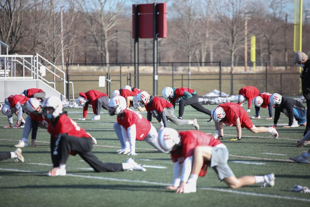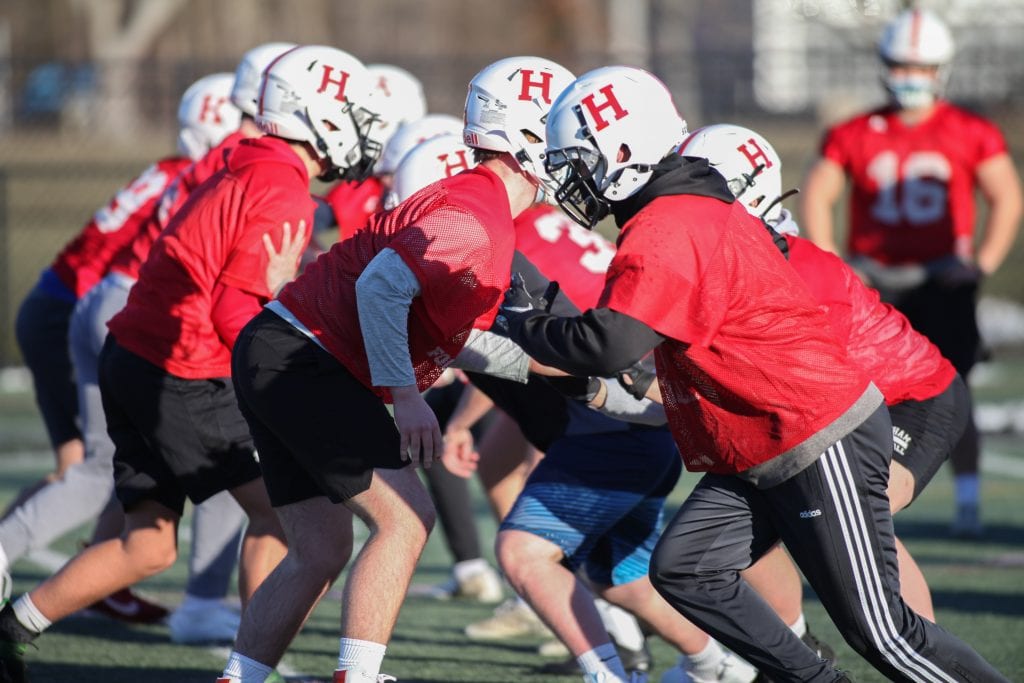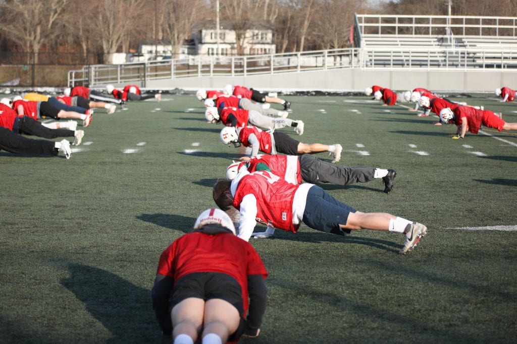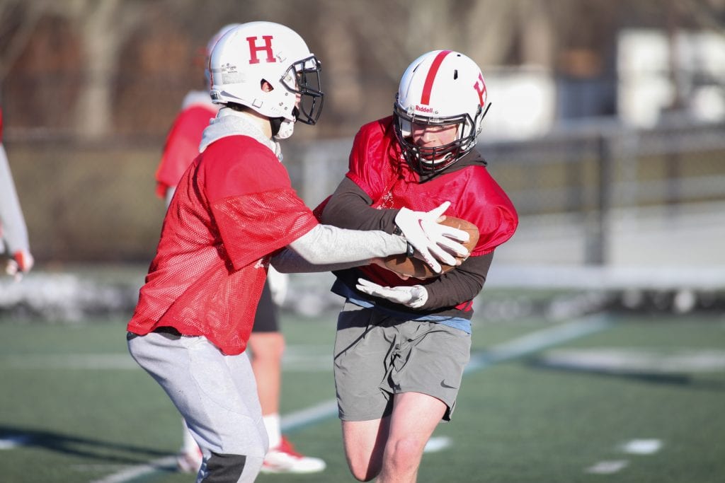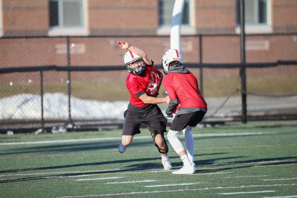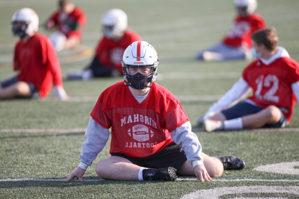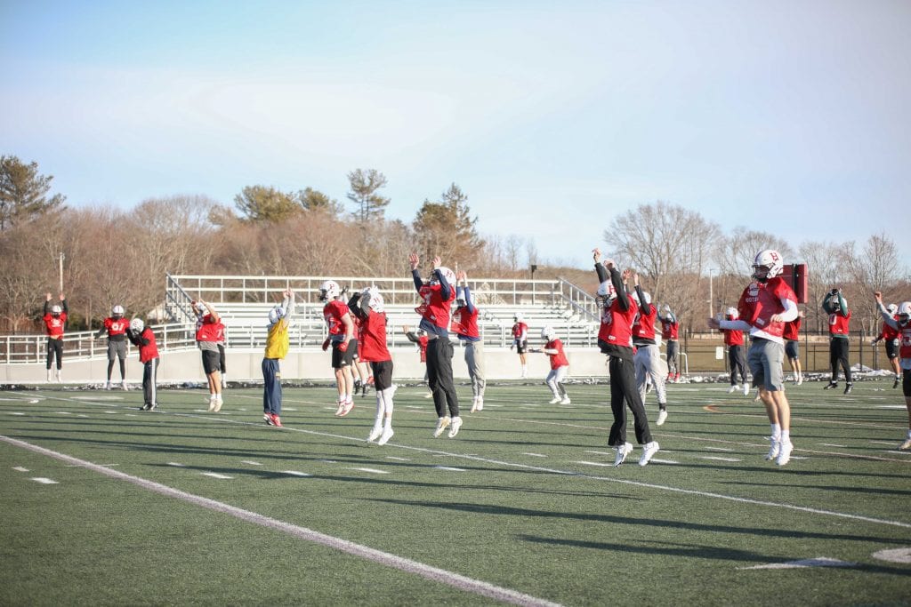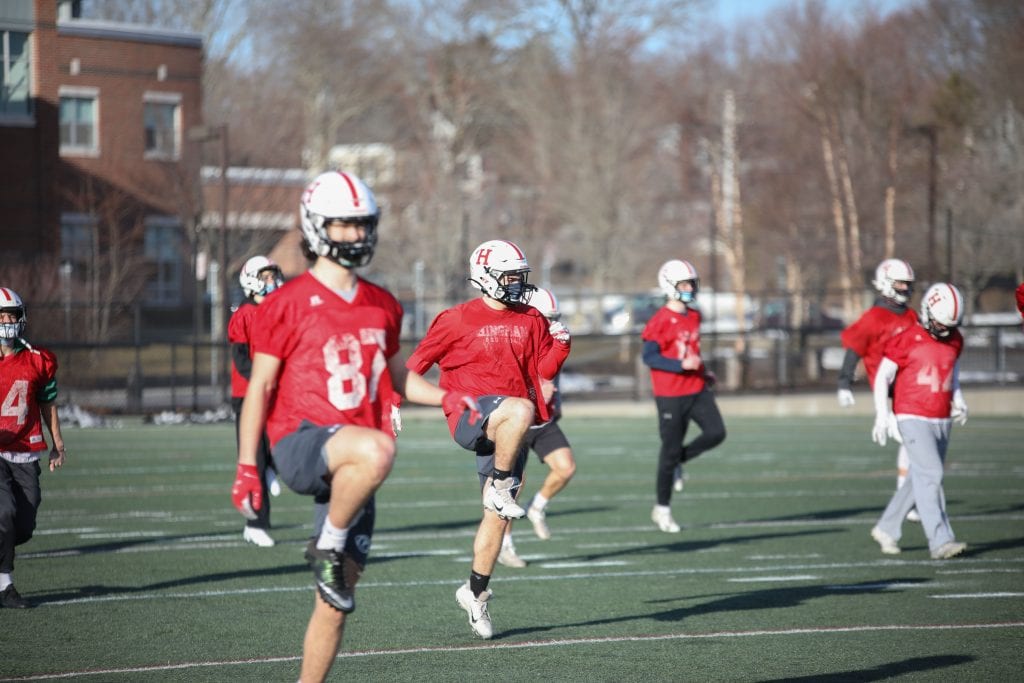 Hingham’s seniors spoke about the season and the challenges facing the football season. The brisk late winter weather that the team is experiencing now is very different from cornerback Charlie Crean spoke to the difference, admitting that, “Honestly at first it was weird to be out here in February but it still feels like a normal season….everyone’s ready to go, we’re all fired up, the goal is still to win a Patriot Cup.” This was echoed by center John O’Connor, “we just have to come out, dress appropriately, and play how it is.”