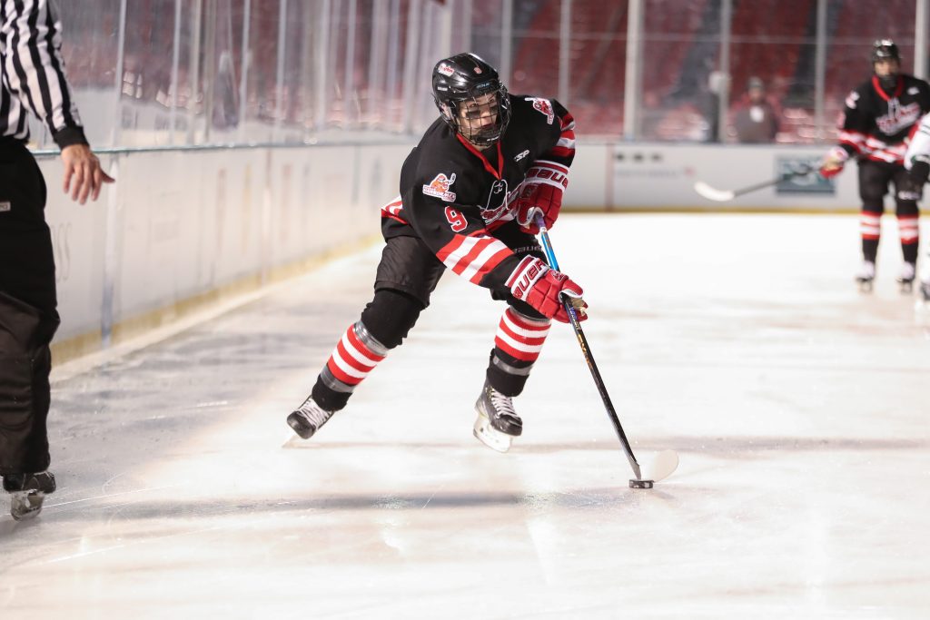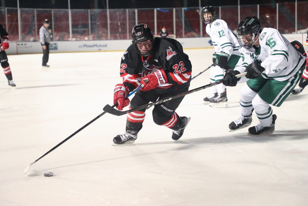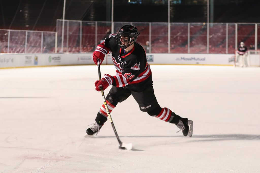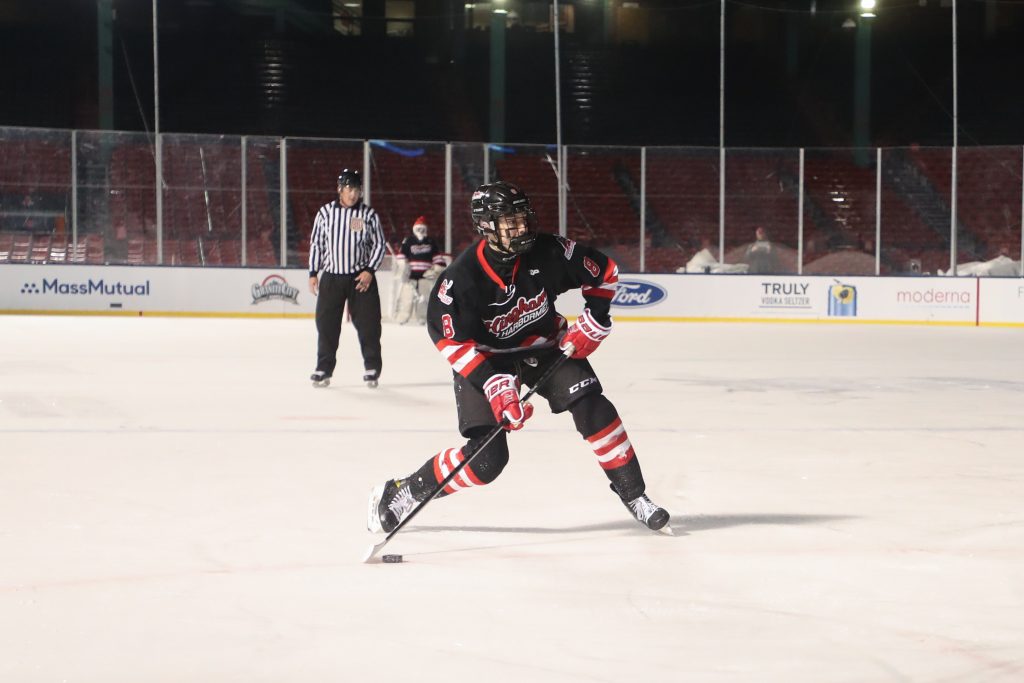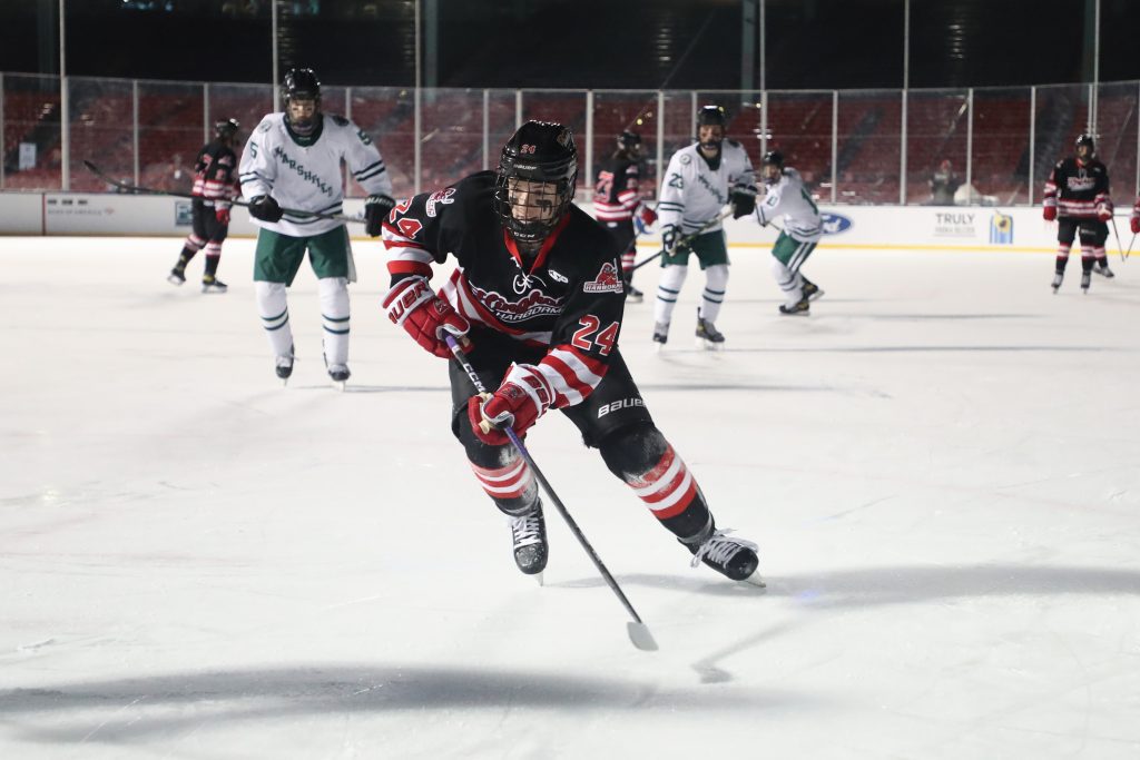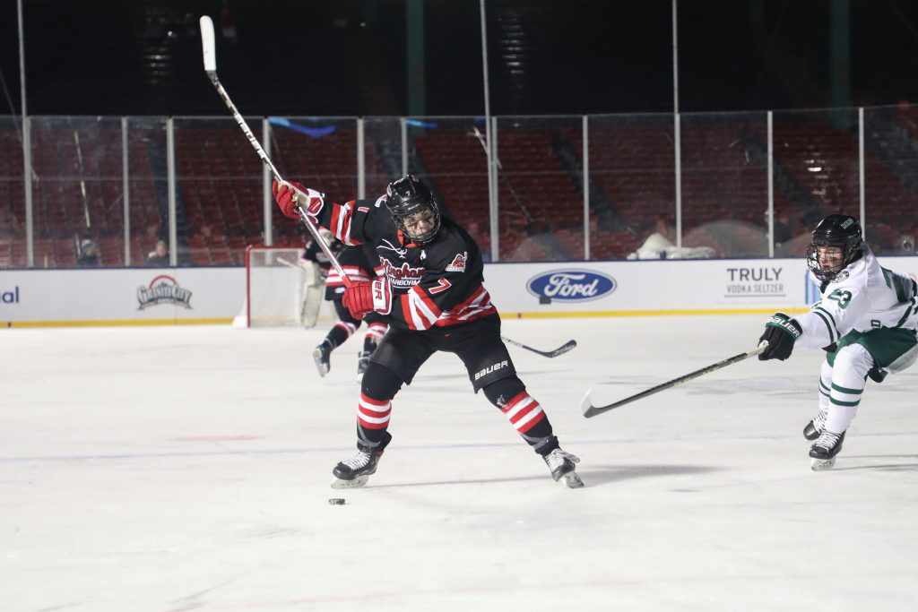“It’s an unreal experience,” says senior captain Chase McKenna after the game. “I’m speechless. I mean, there’s really no words that can describe it. Going on that ice, it’s pretty big. Seeing all those people, it’s something special and I’m super happy I got this experience.”