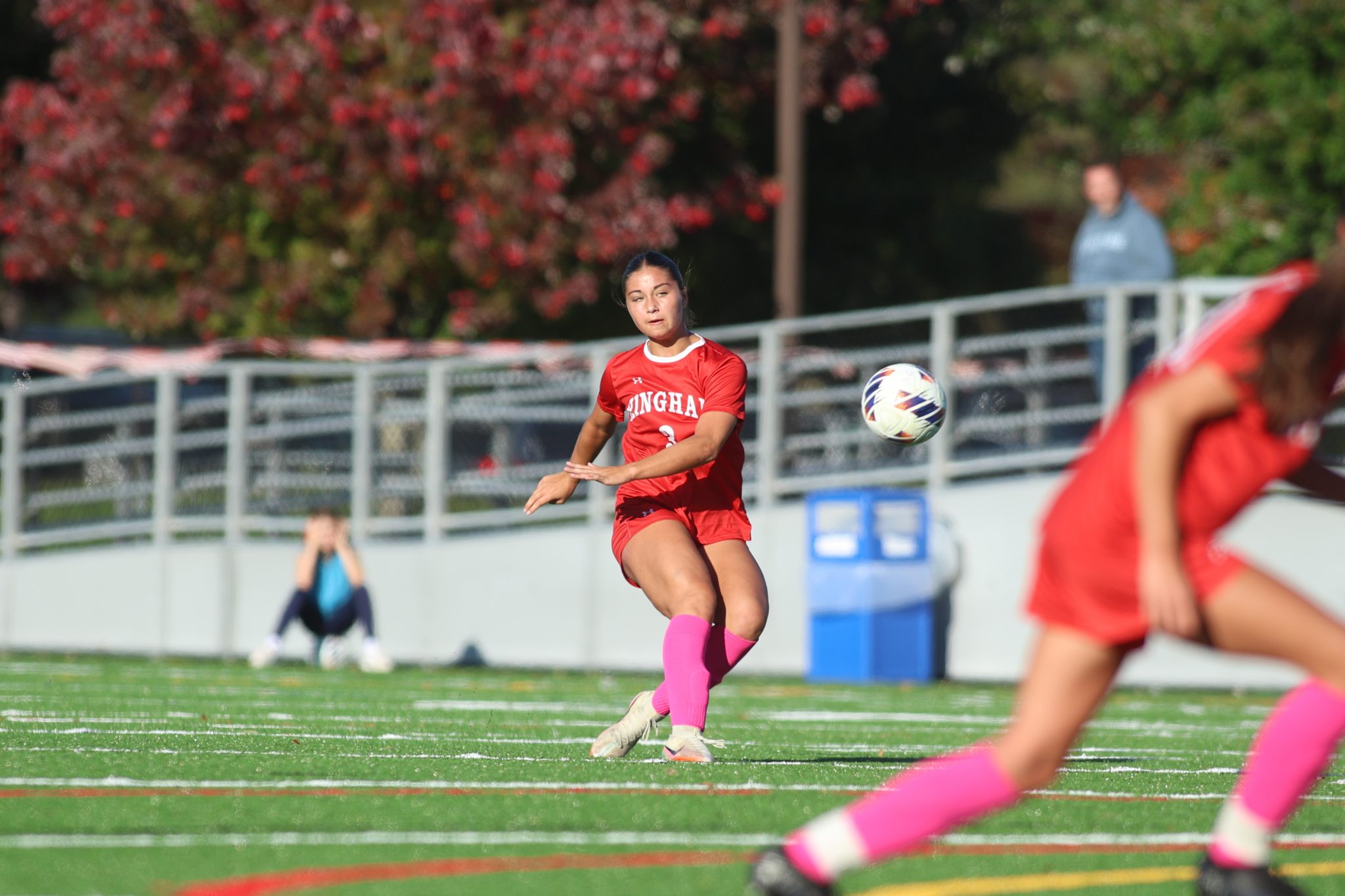“I love that every single player got on the field,” said second year head coach April Tremante. “It was senior night. It was a nice game to honor the seniors. We played well as a team. Whitman-Hanson always plays everyone in the league tough and strong. Most of their games this season have been a one or two goal game. So I knew that going into it, they’re physical, they’re tough. They never give up. We battled hard. We moved people around in different positions. People are flexible. We have a lot of depth on our team this year, so we have a lot of great players. So it’s nice to see out everyone out there working hard.”