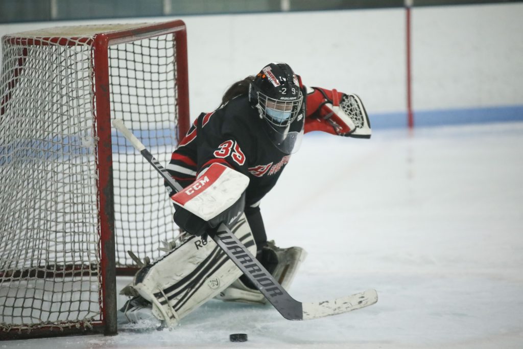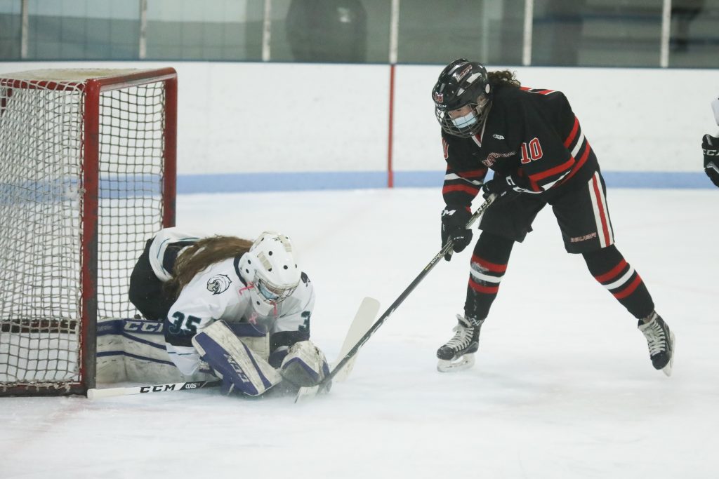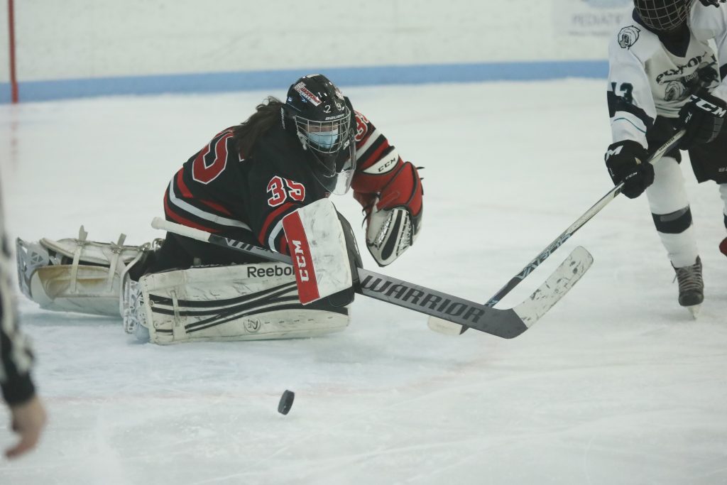 While Hingham was trying to shake off the rust, rookie junior goalie Amy Maffei was keeping them in the game. After letting in an early goal in her first game ever in net, Maffei settled in and stopped a few breakaways and a penalty shot in the 15 minutes of her goalie career. The former forward says it was a little scary out there.