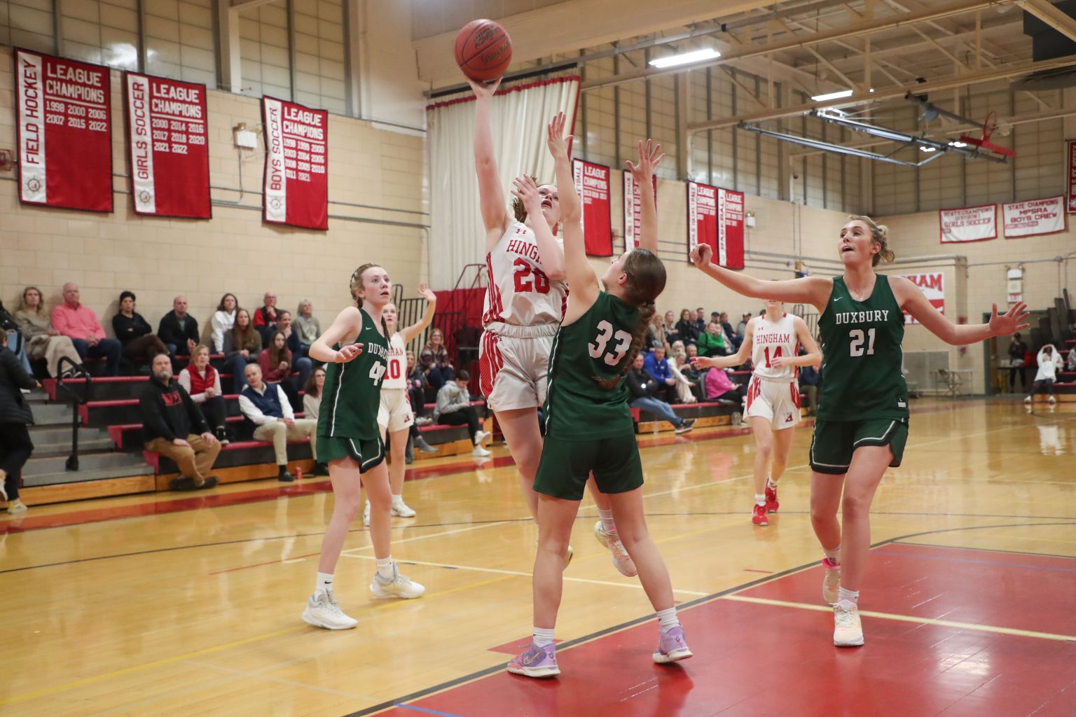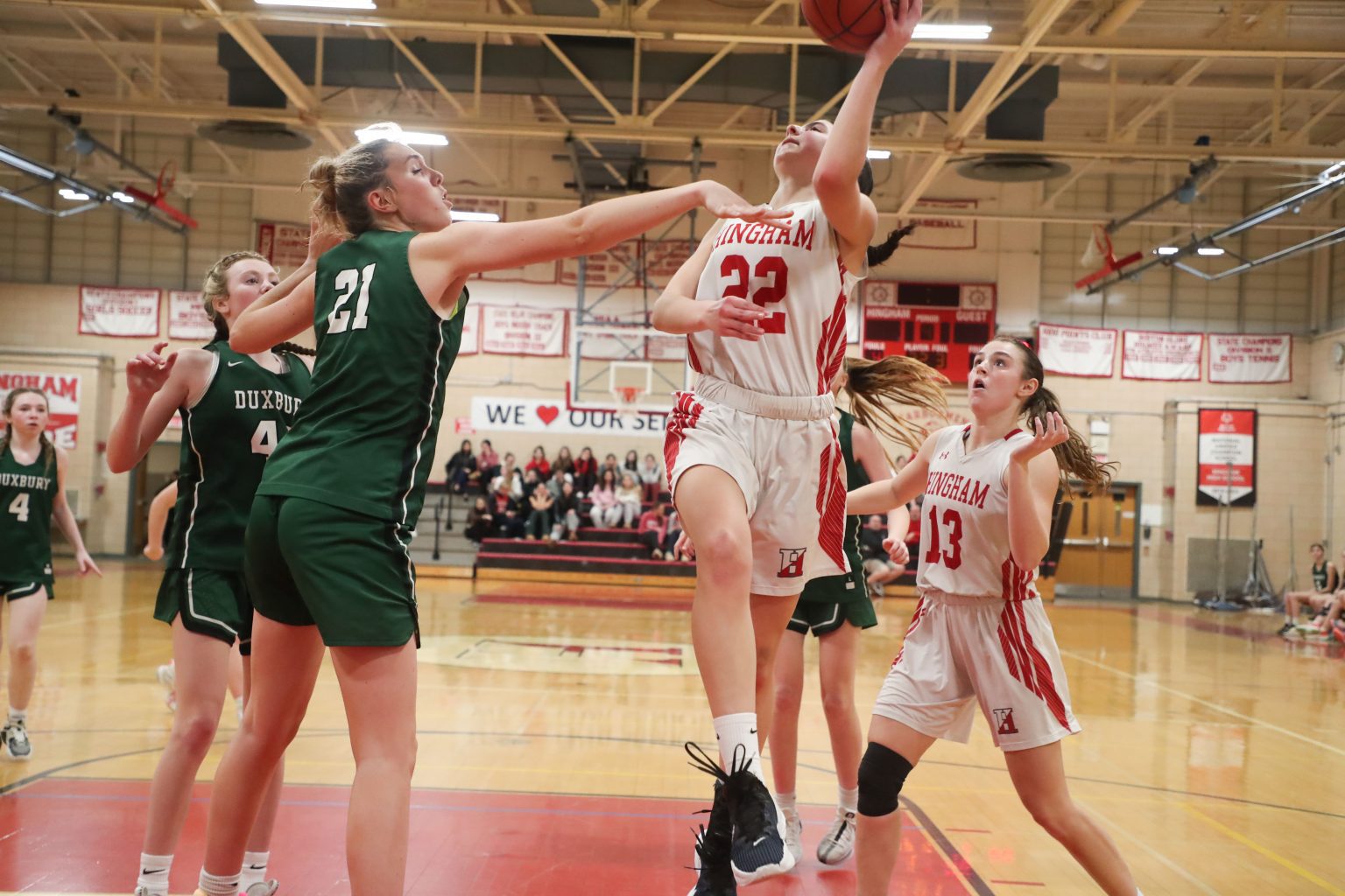 They needed every bit of the those points to weather a crazy last two minutes of the game. A rarely called throw-in technical foul on Hingham, a borderline 5 second violation, and a couple of long range threes by Duxbury made the game closer than it needed to be, but the Harborwomen were strong physically and mentally to finish out their best game of the year 63-59.