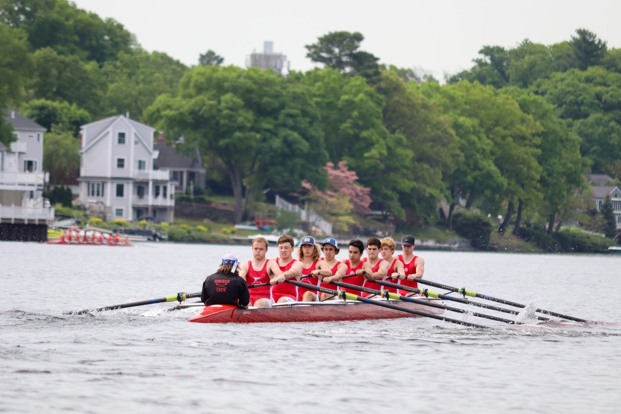 The girls second varsity race was neck and neck down the course as the two boats swapped places for the lead until they reached the final sprint. “And that’s where our 2V shines,” said Kopp. Hingham widened the margin to open water and won the race by seven seconds. Emma O’Horo coxed the second varsity eight boat with rowers Lily Murphy, Devon Moriarty, Helena Orth, Ella Niehoff, Anna Capodilupo, Zoe Angel, Kathryn Feeley, and Sofia Scholund.