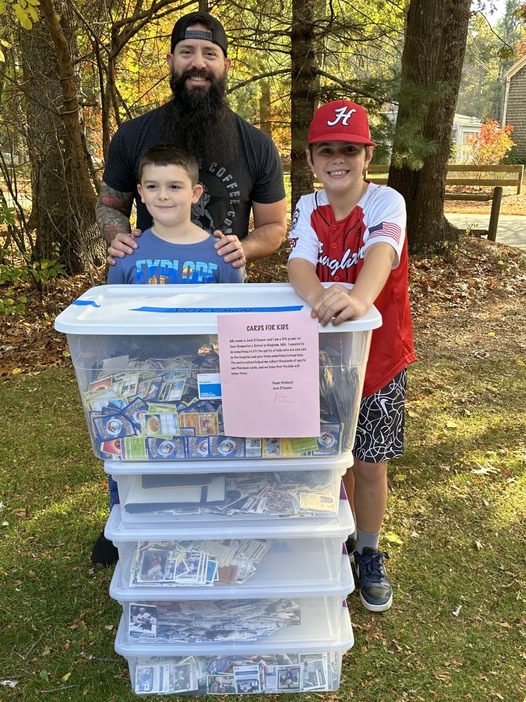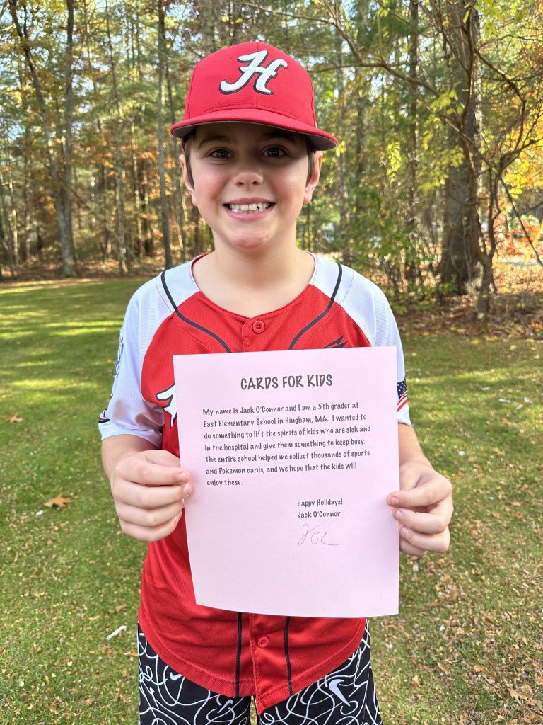 Hingham resident and East School 5th grader, Jack O’Connor recently organized a school wide card donation drive to donate to younger kids who are sick, and hospitalized, over the holidays to lift their spirits and keep them entertained. Through the efforts and generosity of the East School community, thousands of baseball, football and Pokémon cards were donated.