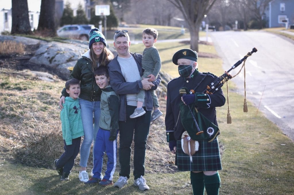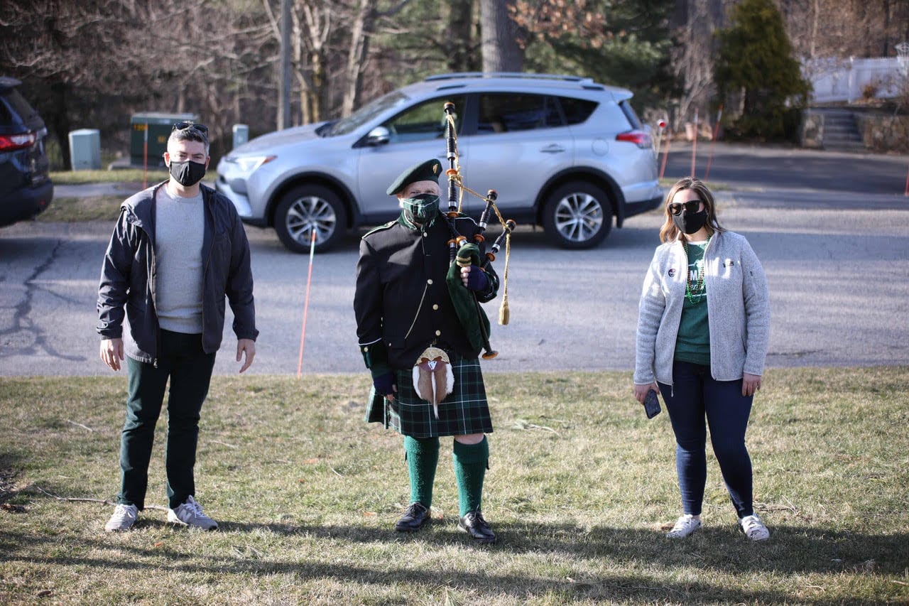 Yesterday, Brian Cavanaugh, a Hingham Resident and local mortgage lender, teamed up with The Hingham Anchor team to bring some luck of the Irish to the Hingham community in honor of St. Patrick’s Day. The team popped up with Bob Cameron, an Irish piper, to play the a few Irish jigs in neighborhoods around Hingham.