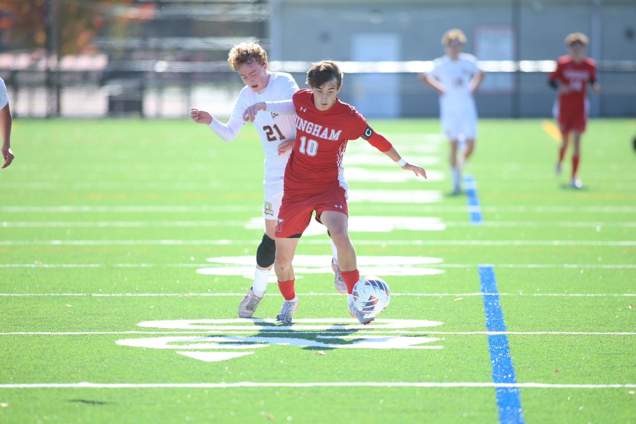 The match started with an early advantage for BC High, as the Eagles took a 1-0 lead halfway through the first half. Hingham, however, refused to be intimidated by the stronger opponent and kept themselves in the game. As Head Coach David Leahy noted, “The first half, we were kind of feeling ourselves out too much. We only let in one, which was very important. That allowed us to have a good talk at halftime and change our ways.”