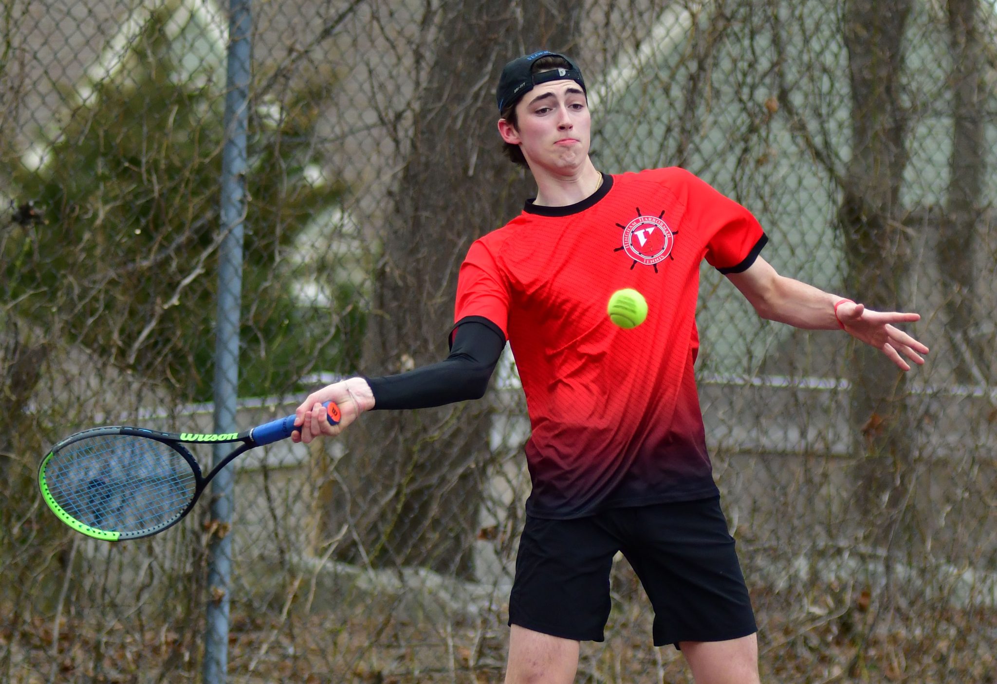 Travis Rugg was downed Cohasset’s Eamon Maxwell at No. 2 singles on Friday.
