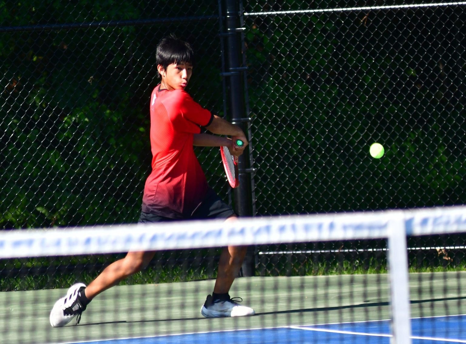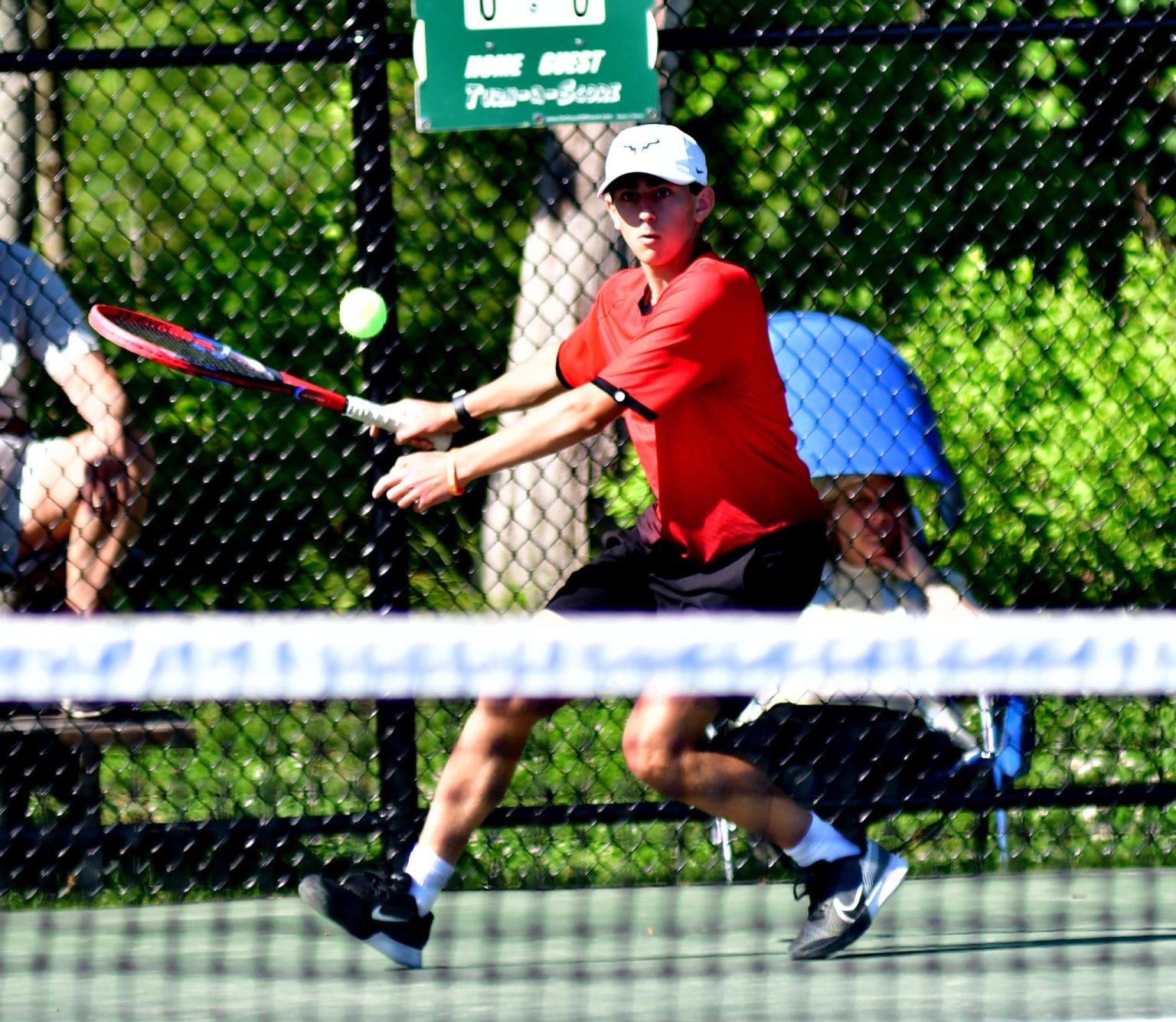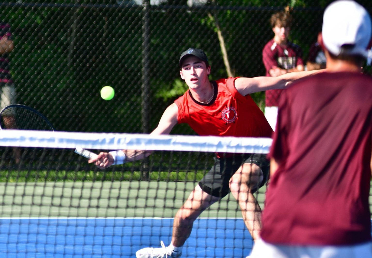 Parker Schultz got things started with a somewhat quick 6-1, 6-2 win over Sharon’s Matthew Lally, followed by a 6-2, 6-0 win by Travis Rugg and Eric Li at first doubles over Sava Kasser and Isaac Chen, setting up the rest of the tense showdown that left Hingham leading 2-1 after Teddy Reilly fell to Milan Kivojev 3-6, 1-6.