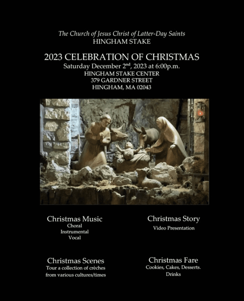 “Our Christmas celebration promises to be a heartwarming gathering filled with inspiring music, heartfelt messages, and a sense of togetherness that captures the true essence of the season,” said Jared Heaton, Stake President for the The Hingham Stake of The Church of Jesus Christ of Latter-day Saints in Southeast Massachusetts. “It will be a time to rejoice, count our blessings, and share the love that defines this special time of the year. We invite all community members to join us and make this Christmas an even more memorable and meaningful experience for everyone.”