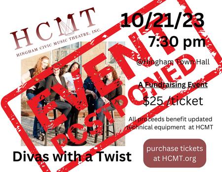 Hingham Civic Music Theatre has had to postpone the “Divas with a Twist” program, originally scheduled for Oct. 21. The new date will be selected later this year to support HCMT’s 75th anniversary with a fundraiser connected to the “Divas” performance.