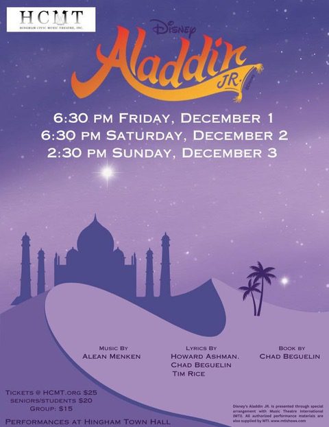 “Aladdin Jr.,” Hingham Civic Music Theatre’s next show, offers “A Whole New World” of exuberant fun in its three performance, Dec. 1, 2 and 3, on Town Hall’s Sanborn Auditorium stage.