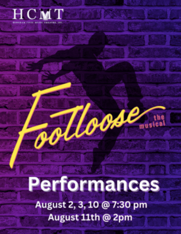 Songs sung by members of the 30-person cast include “I Can’t Stand Still,” “Holding Out for a Hero,” “Heaven Help Me” and “Almost Paradise.” Music is by Tom Snow and other composers, with lyrics by Dean Pitchford, and Kenny Loggins as an additional lyricist. “Footloose” first ran on Broadway in 1998, based on the popular 1984 movie. For an early look at “Footloose” cast members, you’ll see them on display in Hingham’s Fourth of July parade.