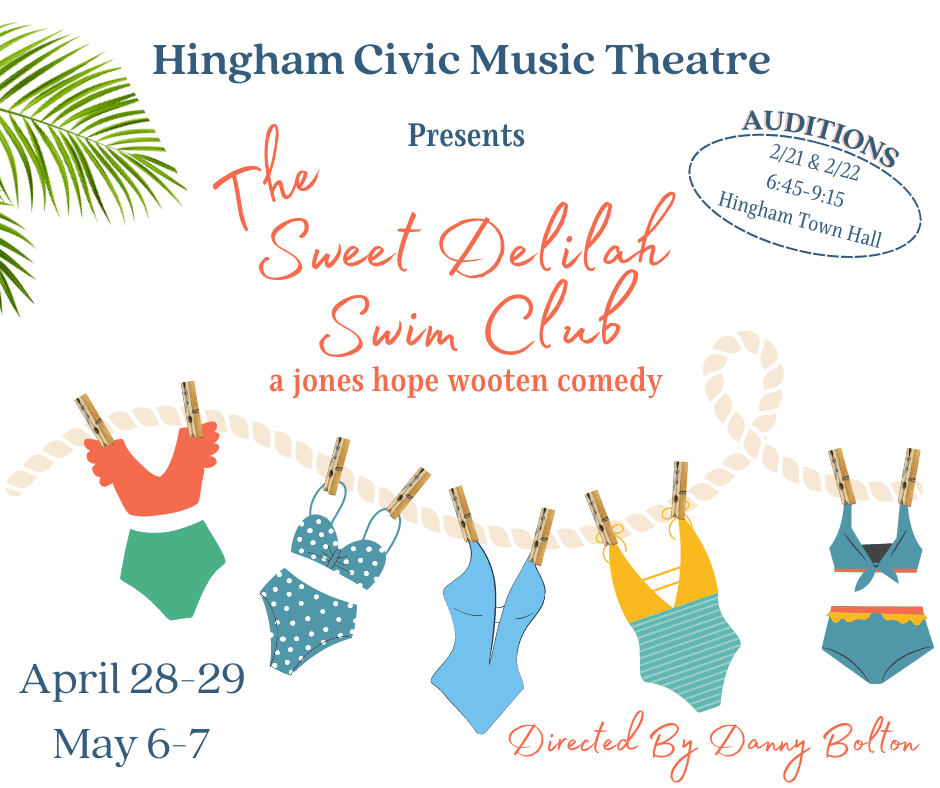 Calling all South Shore actresses: Auditions for the hilarious comedy “The Sweet Delilah Swim Club” have been scheduled by Hingham Civic Music Theatre for Tuesday and Wednesday, Feb. 21 and 22.