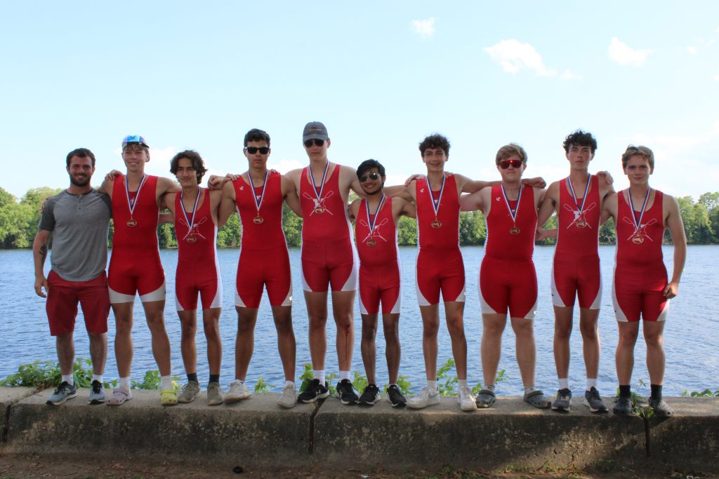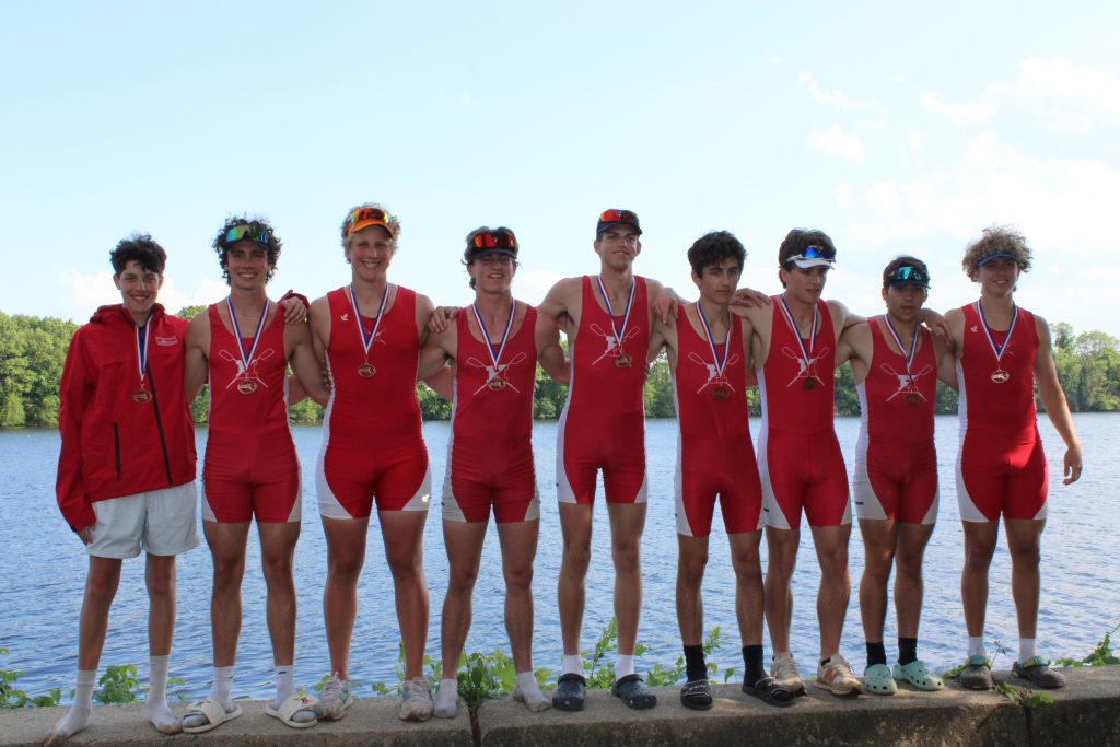 Hingham’s 1V crew with their bronze medals (from L-to-R): Jack Levy, Dylan Drew, James Feeley, Sam Ackerman, Walker Bogen, Will Barry, James Barry, Slater Fairfield, and Josh Bradshaw.