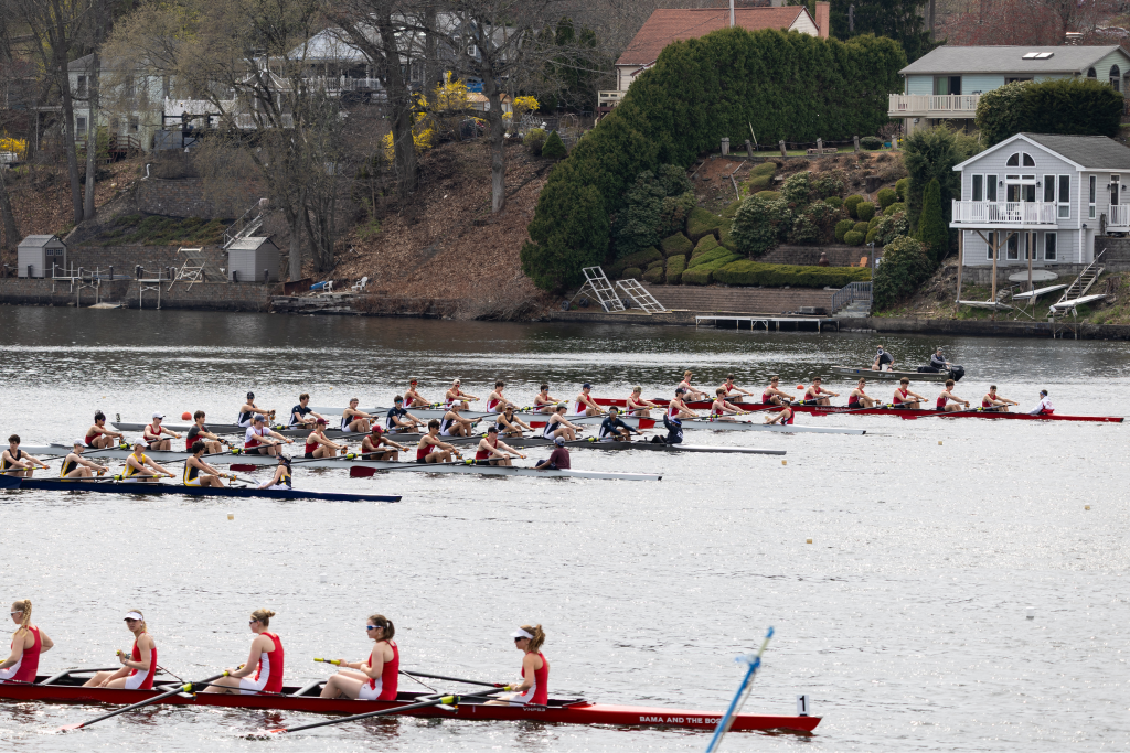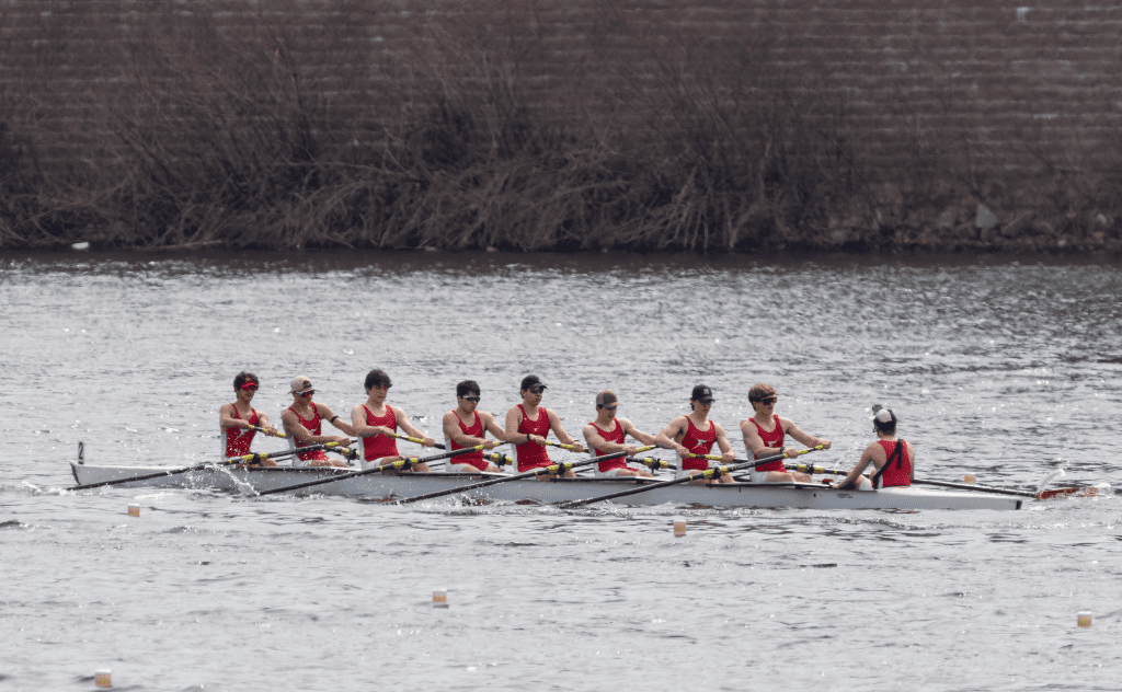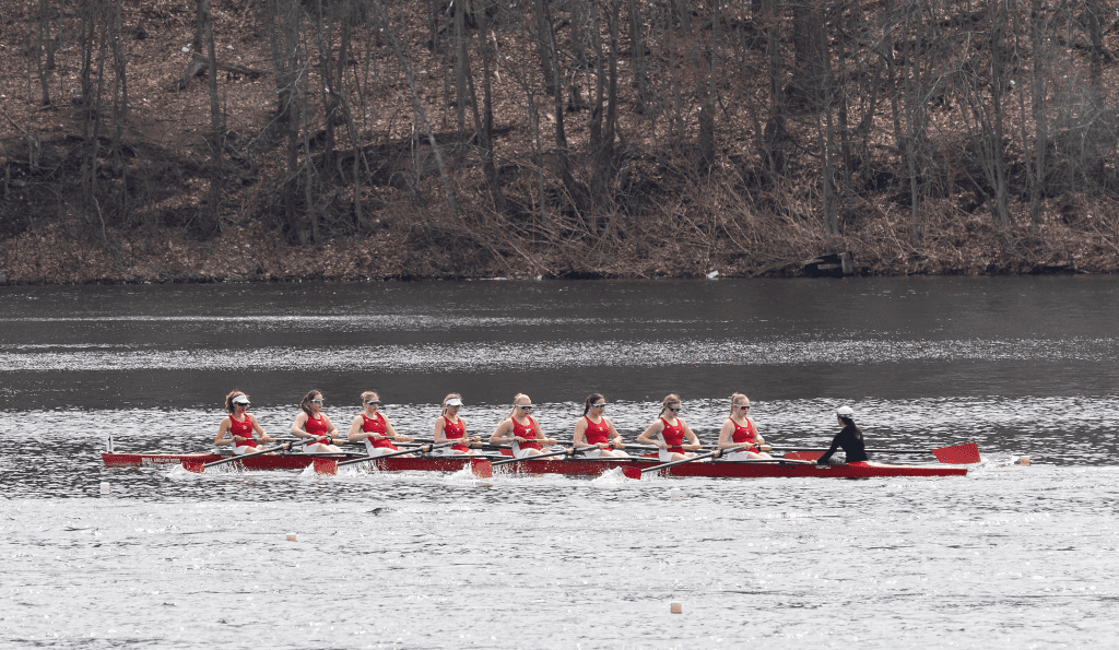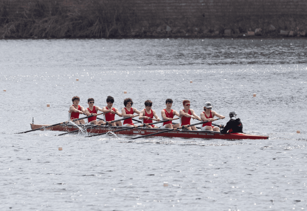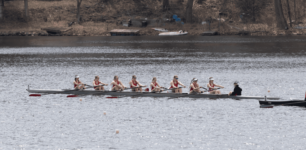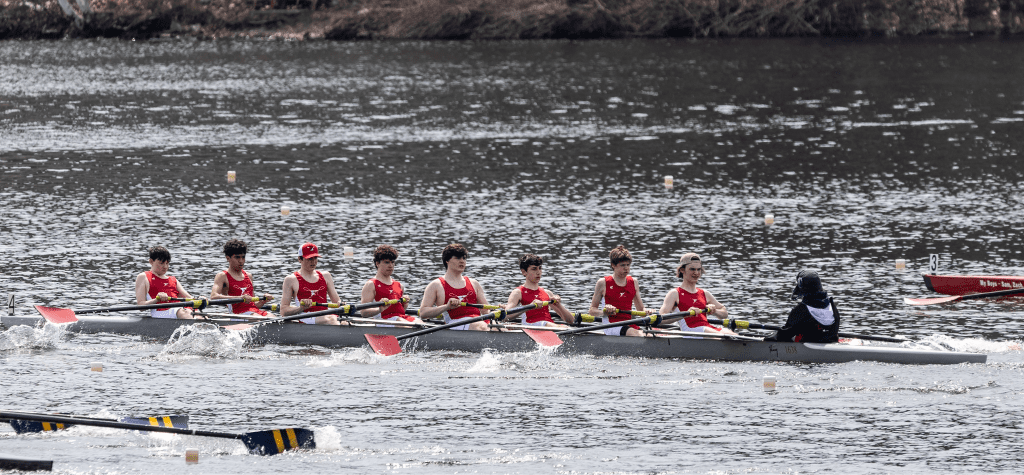 This Saturday, on a beautiful spring afternoon in Shrewsbury on Lake Quinsigamond, Hingham Crew opened the racing season at the Exeter Invitational. Hingham faced off against local powerhouses Exeter, Kent, Boston Latin, Simsbury, and St. John’s, demonstrating plenty of early-season poise and promise. With a light cloud cover, temperatures hovering near 80 degrees, and strong, 15-20 mph westerly cross head winds (gusts to 35 mph), conditions were challenging, but favorable. Unlike the Fall Head Racing, which is a longer, timed race, Spring Sprint Racing requires boats to line up across from one another and race all out for approximately 1,500 meters. The races are a test of a team’s ability to maintain their power and precise rowing motion in an all-out sprint to the finish line.