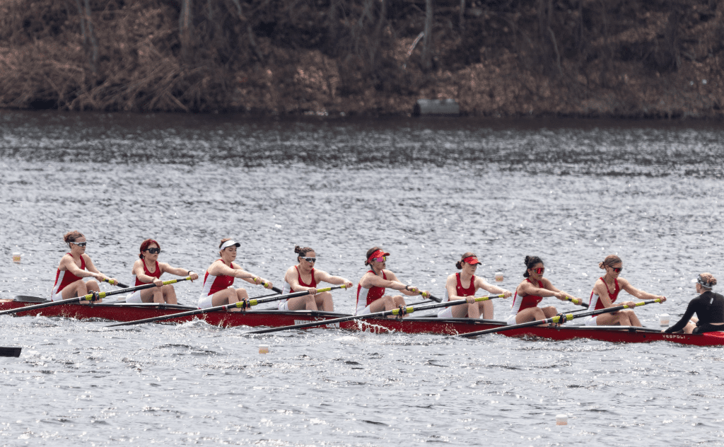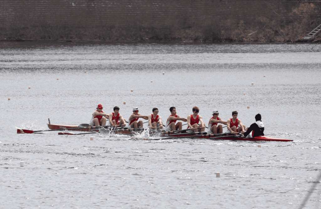 The Hingham girl’s fourth varsity, with coxswain Ashley Sinkus, stroke Veronica Webb, Haley Kost, Taylor Sargeant, Eva O’Sullivan, Rose Lovendale, Ava Kelly, Annie Kyriss, and bow Celia McCarthy, went head-to-head with Exeter, scoring a massive win by almost 20 seconds. The girls showed the depth and power of the Hingham team, easily beating one of the best rowing programs in the region.