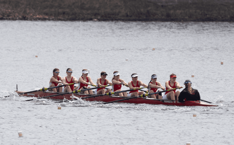 The boys second varsity, with coxswain Jordan Brown, stroke Owen Cerrato, Landy Vittorini, Brendan Engel, Hector Munoz, Spencer Farish, Lucas Mangili, Gerard Bottini, and bow Zakary Robbins, showed great fight against extremely strong competitors. The Hingham boys finished amidst a flurry of other boats, beating out the Simsbury entry and demonstrating great early season power. Boys head coach Sarah Dewey is excited about the boys ability to overcome adversity and fight hard, “Dave and I are super proud of the effort the boys put into their races. In spite of some gusty crosswinds and lack of water time, all the crews executed their race plans and rowed bravely for each other throughout the course.” Expect big things to come from the boys as they continue to grow at every opportunity.