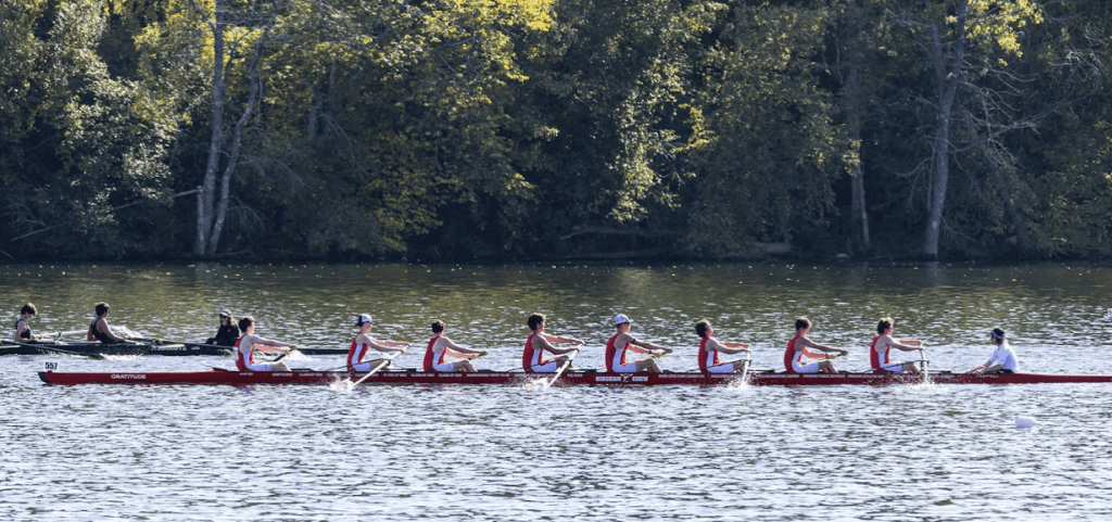 Under bright fall sunshine and spectacularly warm temperatures ranging from the high 70s to mid 80s, the Hingham High Crew team delivered one of its strongest performances in recent memory at the 46th Annual Textile River Regatta this past Sunday. With calm winds and a steady current setting ideal racing conditions, Hingham’s rowers earned multiple medals and showcased impressive depth, skill, and determination across all levels of competition.