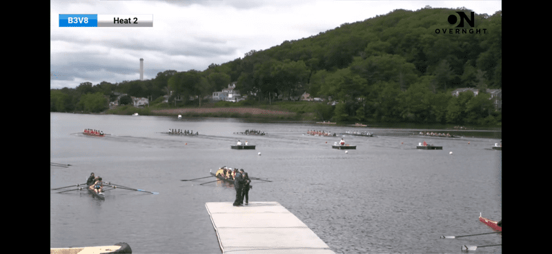 On Saturday morning, amid intermittent rain squalls and light breezes, a series of heats were held to qualify boats for the petite finals (top 7-12 boats) or grand finals (top 1-6 boats). The first boat to race was the Hingham third varsity, with coxswain Ginger Niehoff, stroke Stella Gutierrez, Anne Sargent, Jane Betti, Ellie White, Taylor Sargent, Eme Bias, Lydia D’Arcy, and bow Peyton Burke, who managed to beat Kent, Glastonbury, and East Lyme – finishing just three seconds behind St. Paul’s for second place, but still managing to put Hingham into their first Grand Final race since 2016! In the afternoon race, the Hingham girls continued their amazing performance as they managed to power their way past Exeter and Duxbury, into an unprecedented fourth place finish. This result establishes the Hingham third varsity as the fourth fastest third varsity boat – public or private – in New England, demonstrating the depth of talent and power on the Hingham team.