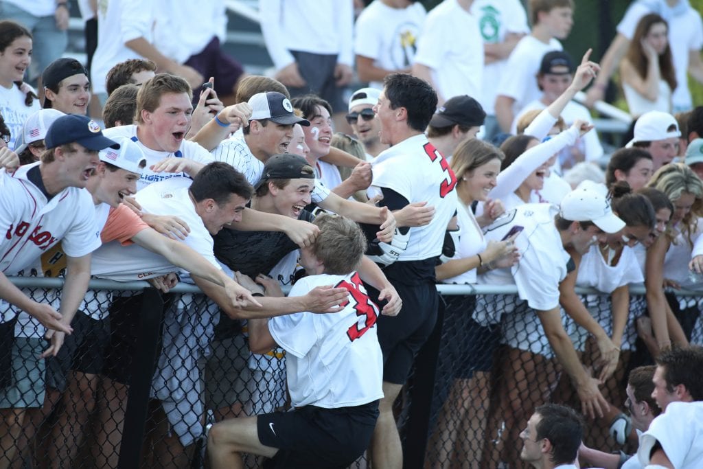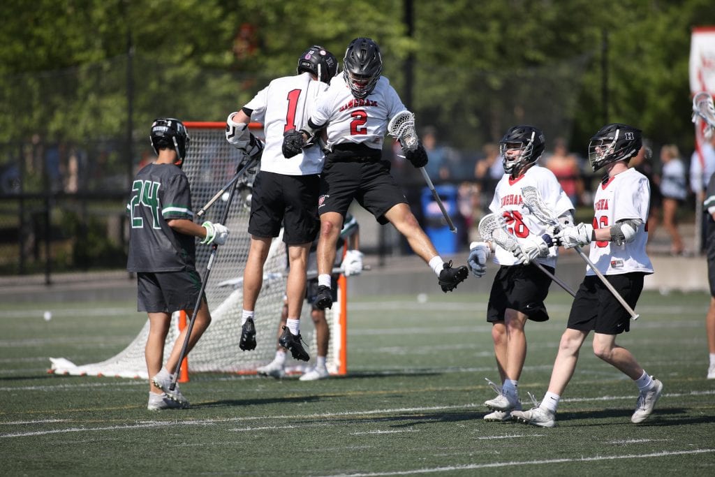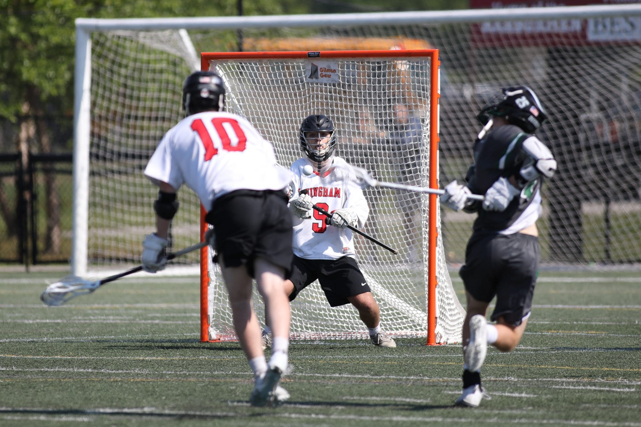 The Dragons won the resulting faceoff and threatened to score. A personal foul on Hingham gave Duxbury the ball with just two seconds left in the game as the whole field held its breath. A desperate shot by Duxbury bounced just in front of Bellomy as the goalie positioned himself to deflect the ball and make the save as the horn sounded. Hingham won the game 11-10, and the stands came alive with cheers as students and parents leaped to their feet.