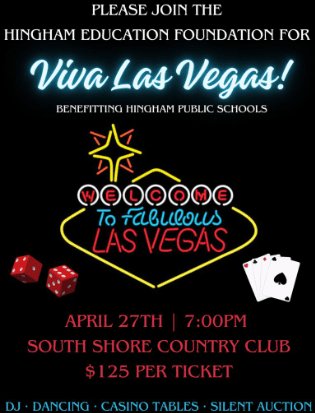 The Hingham Education Foundation hosts its Spring fundraiser Saturday night. The South Shore Country Club will be transformed into the casino floor with Black Jack and other tables, a DJ, dancing and silent action.