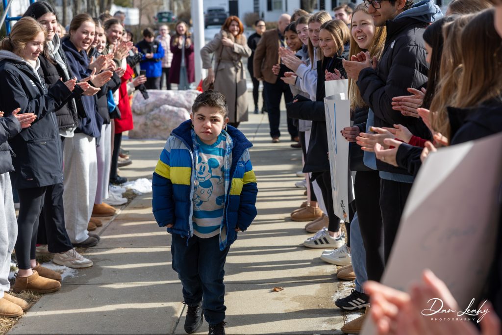 Along with police officers and firefighters, Sebastien’s surprise celebration included comfort dogs from the Plymouth County Comfort Dogs Program, accompanied by their handlers, dozens of students from Hingham High School, and many of Sebastien’s classmates and neighbors, all gathering to surprise Sebastien and wish him well on his wish trip. The students’ energetic welcome line greeted Sebastien, who was overwhelmed but joyful as he took it all in.