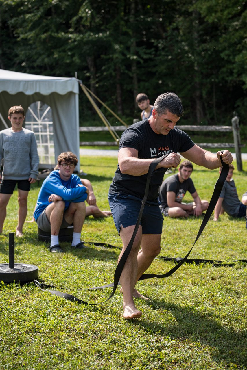 “The next workout run by Hingham Strength and Conditioning Coach Mike Monarch, owner of Hingham’s Mass MVMNT. He set us up with a 4 Tabata work outs consisting of various cross training workouts using sprints, kettle bells, battle ropes, and core slams, all types of carries, squats, and cleans. And that was just the start of the day before breakfast. Afterwards we would have multiple wrestling practices through the day focusing on a technique, drills, then live wrestling. Then there was lunch and recovery which was fun jumping off rocks and swimming in the river. Then more wrestling practice before dinner and campfires that included the campers discussing their experiences that were motivational and fun.”