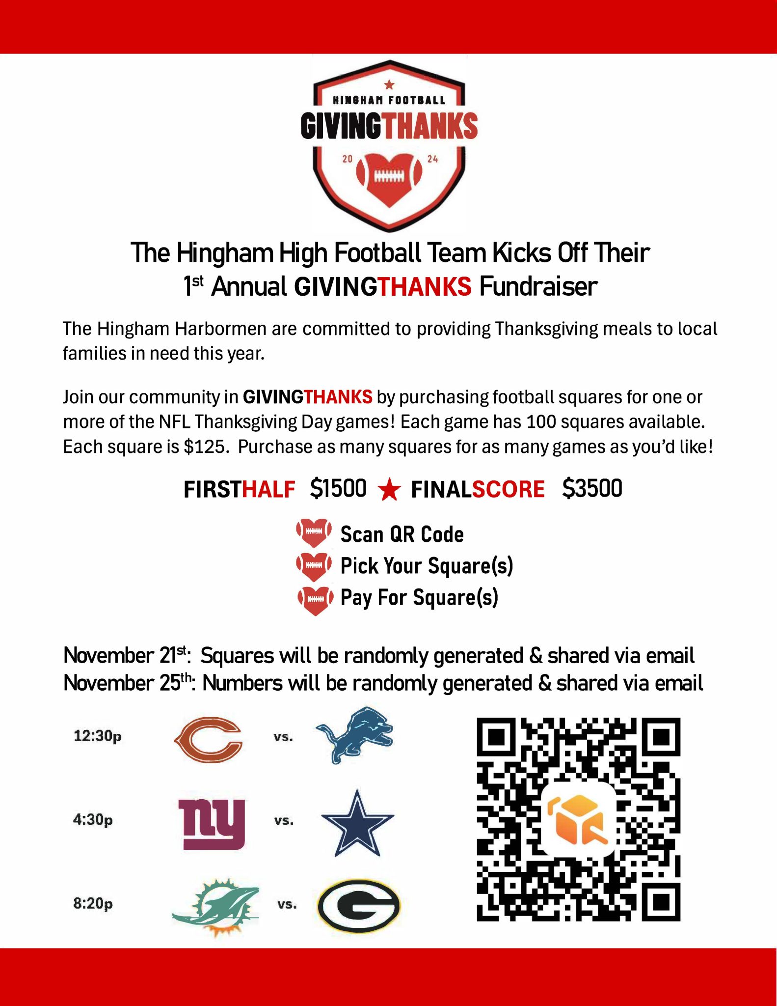 The fundraiser allows supporters to purchase squares for one of the NFL Thanksgiving Day games, with participants getting the chance to win cash prizes of up to $3,000. All contributions go directly to sustaining and enhancing the Hingham Football program. The boosters’ organization is a certified 501(c)(3) entity, making most donations potentially tax-deductible.