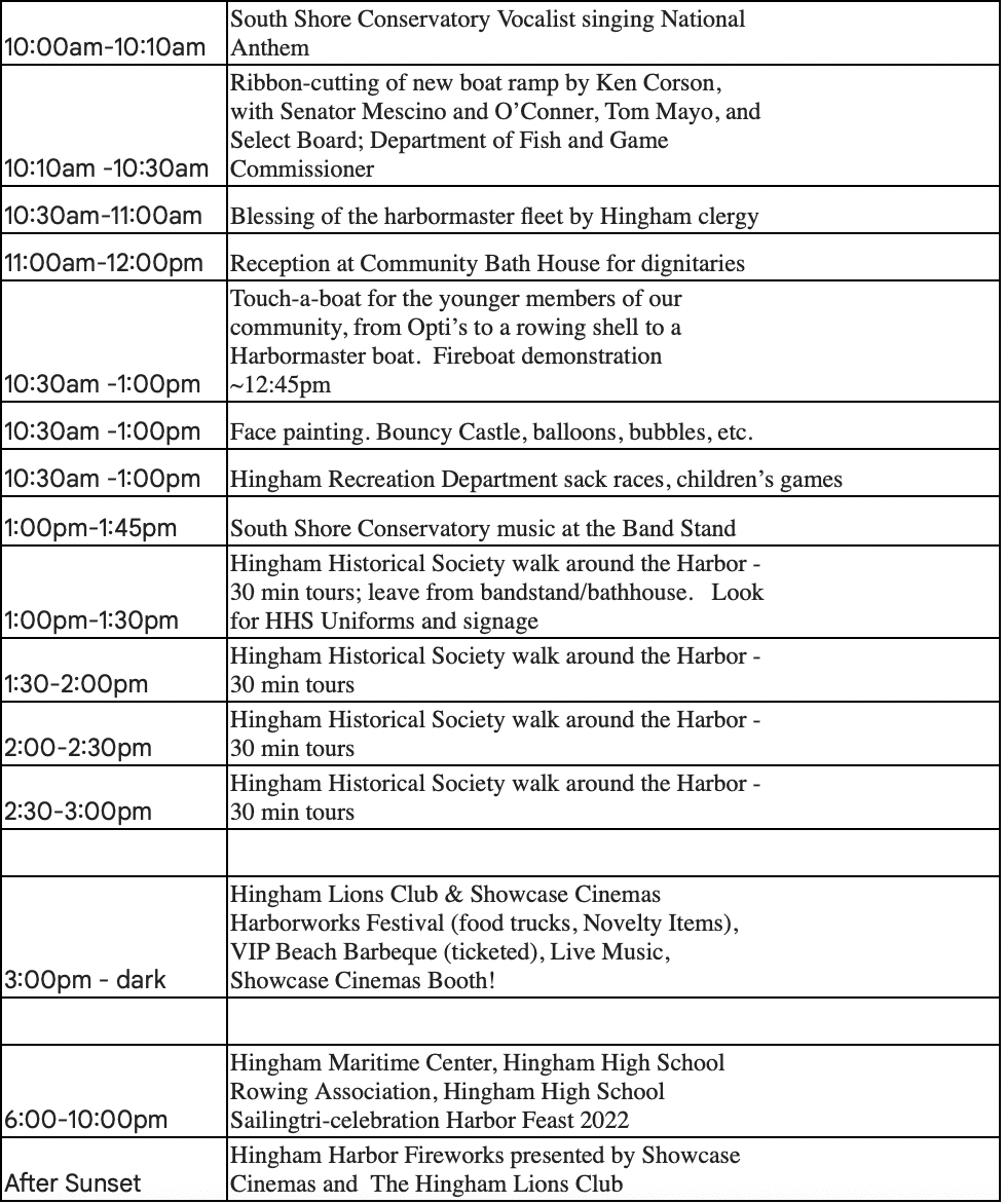 “This is just the first part of the day.  With the Hingham Lions Club having obtained permission to launch their afternoon music and food events, and Hingham Maritime Center’s annual Harbor Feast celebration starting at 6 p.m., this is going to be one of the best Fall days in town,” Boer said. Vice-Chair of the Harbor Development Committee William Reardon notes that “the evening fireworks provided by the Hingham Lions Club and sponsored by Showcase Cinemas will cap off a spectacular day.”
