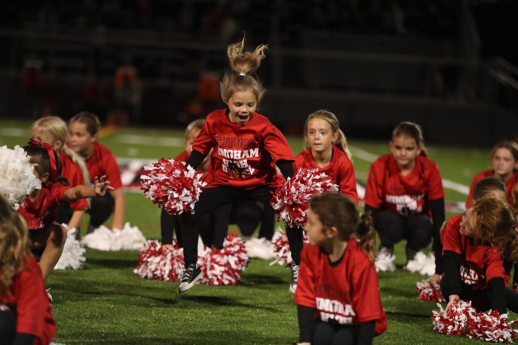 Under the lights at last Friday’s Hingham High football game, children between the ages of 5 and 11 were given a unique opportunity to be mentored by and perform on the field with the Hingham High Dance Team.