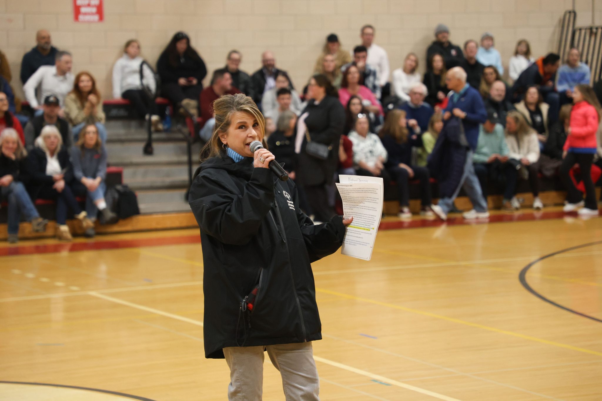 During halftime of last night’s 3rd Annual Unified Basketball vs Police game, Denise Larrabee – Special Olympics Masssachusetts’ Manager of Inclusion Schools Program and former Hingham resident, presented head coach Marlee Stanley, AD Jim Quatromoni, and the rest of the unified athletes with this year’s banner.