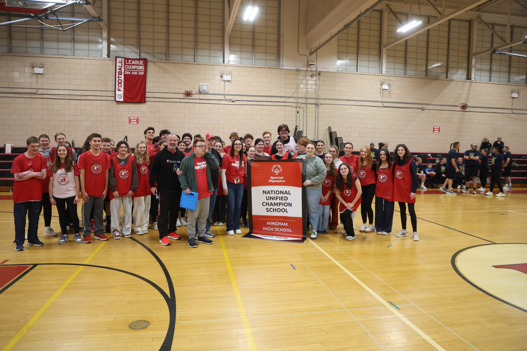 Hingham High School has once again been given the distinction as a National Unified Champion School by Special Olympics. Hingham is one of only 17 Massachusetts schools “receiving this distinguished status as a result of meeting 10 national standards of excellence in the areas of inclusion, advocacy, and respect.” HHS currently hangs a similar banner for the same award for the 2019-2023 school years.