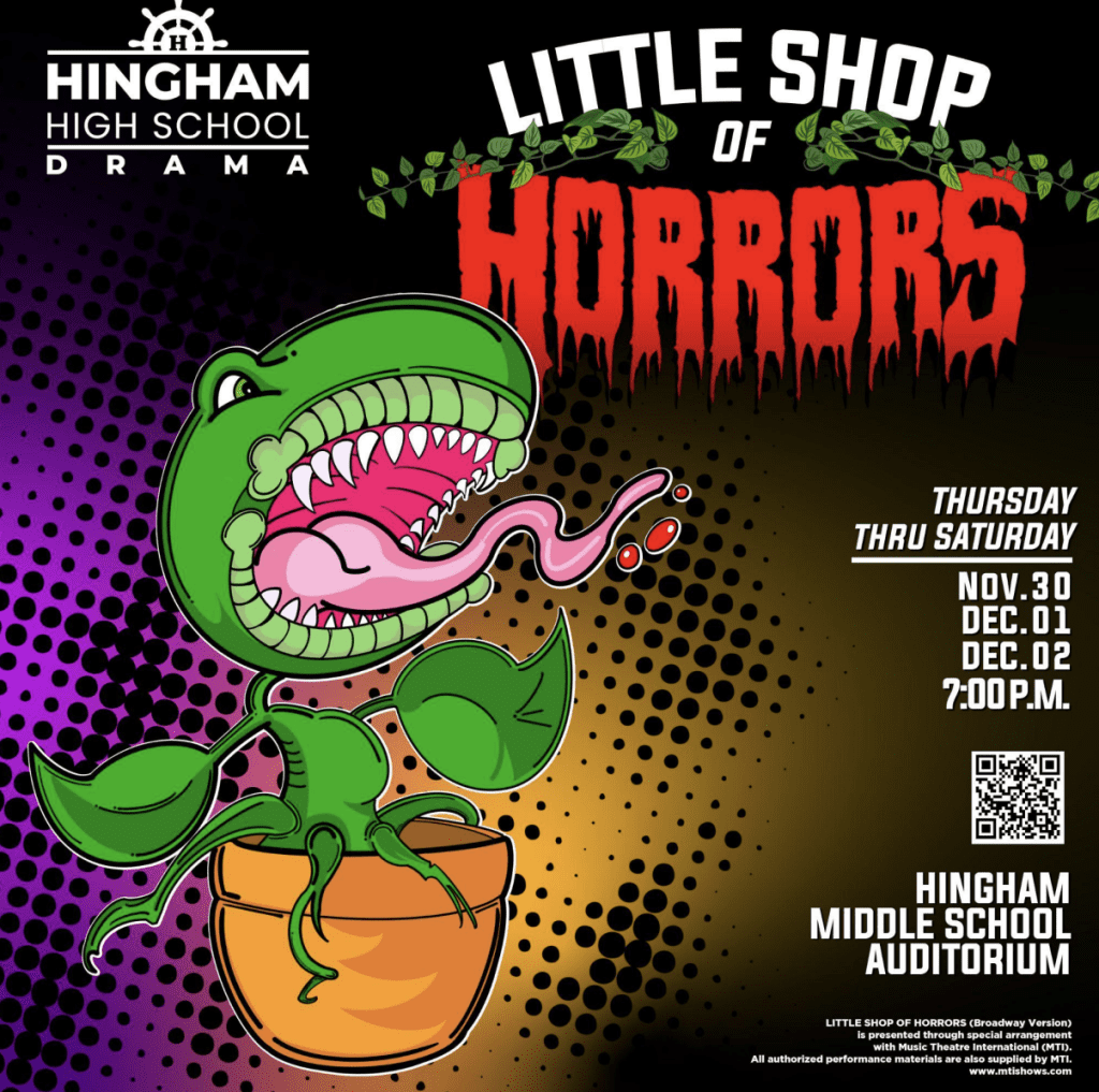 The Hingham Public Schools Fine Arts Department and the Hingham High Drama Program are proud to present “Little Shop of Horrors” coming November 30th running through December 2nd.