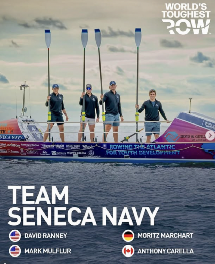 As of this writing Ryan’s team, Team Seneca Navy is 4th out of 43 competitors having departed from La Golerma in the Canary Islands and heading for English Harbor in Antigua. They have rowed 1958 miles with 704 miles to go and can be followed at worldstoughestrow.com – The World’s Toughest Row.